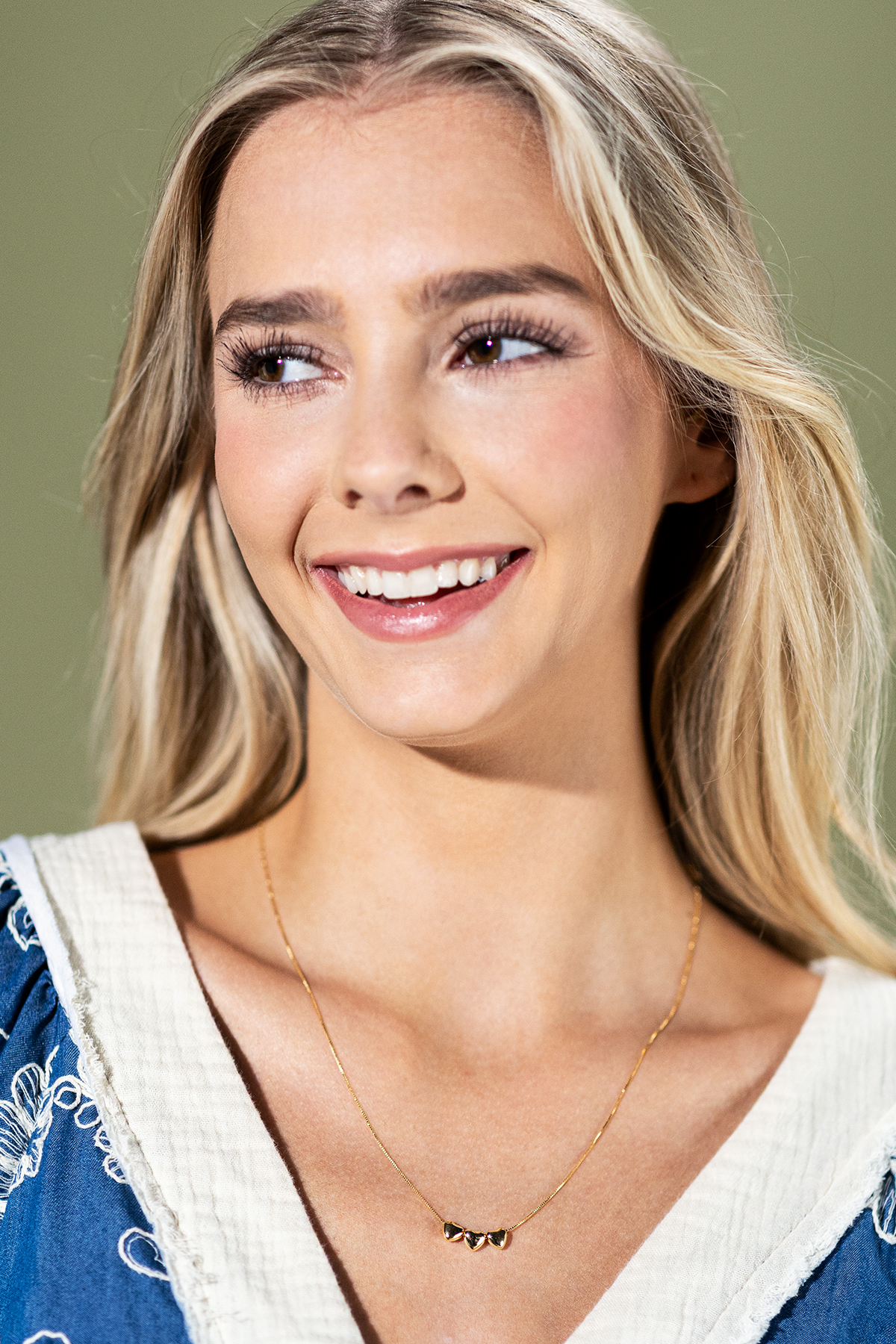 This 18K gold-filled necklace features three petite heart charms strung along a fine dainty chain. Each heart catches the light with a soft gleam, symbolizing love in its purest form.