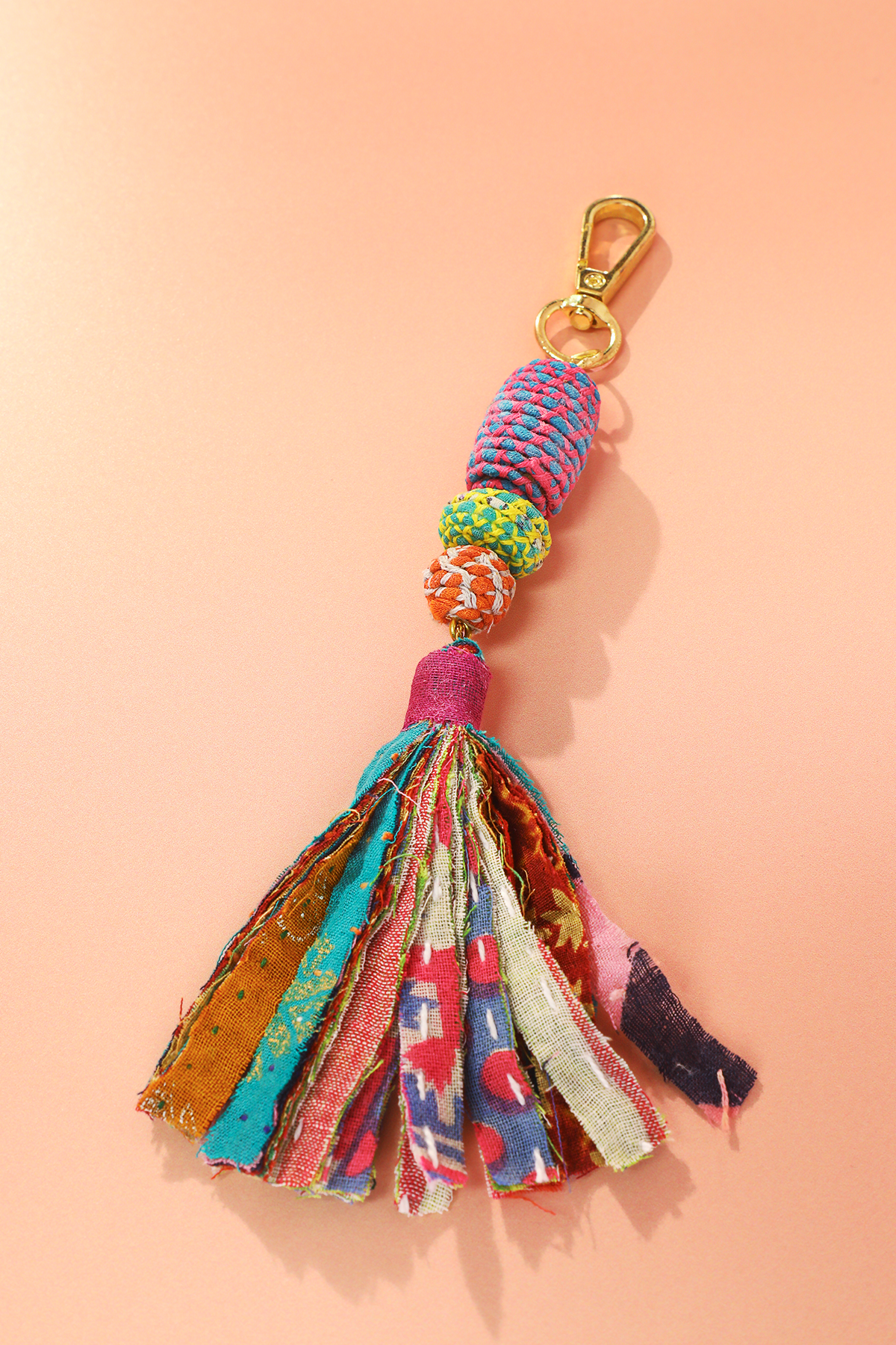 The Sunwoven Tassel Keychain captures the warmth of handmade artistry in motion. Hand-wrapped cotton beads stack like tiny treasures above a flowy, mixed-fabric tassel in shades of coral, marigold, and sky. Clip it to your keys, tote, or travel bag for a burst of sunshine that moves with you.