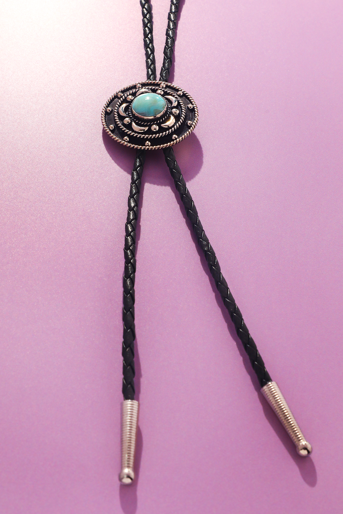 Bold, round, and made for the spotlight. This vintage-inspired bolo features an etched circular concho centered with stone. This bolo radiates desert charm and western edge.