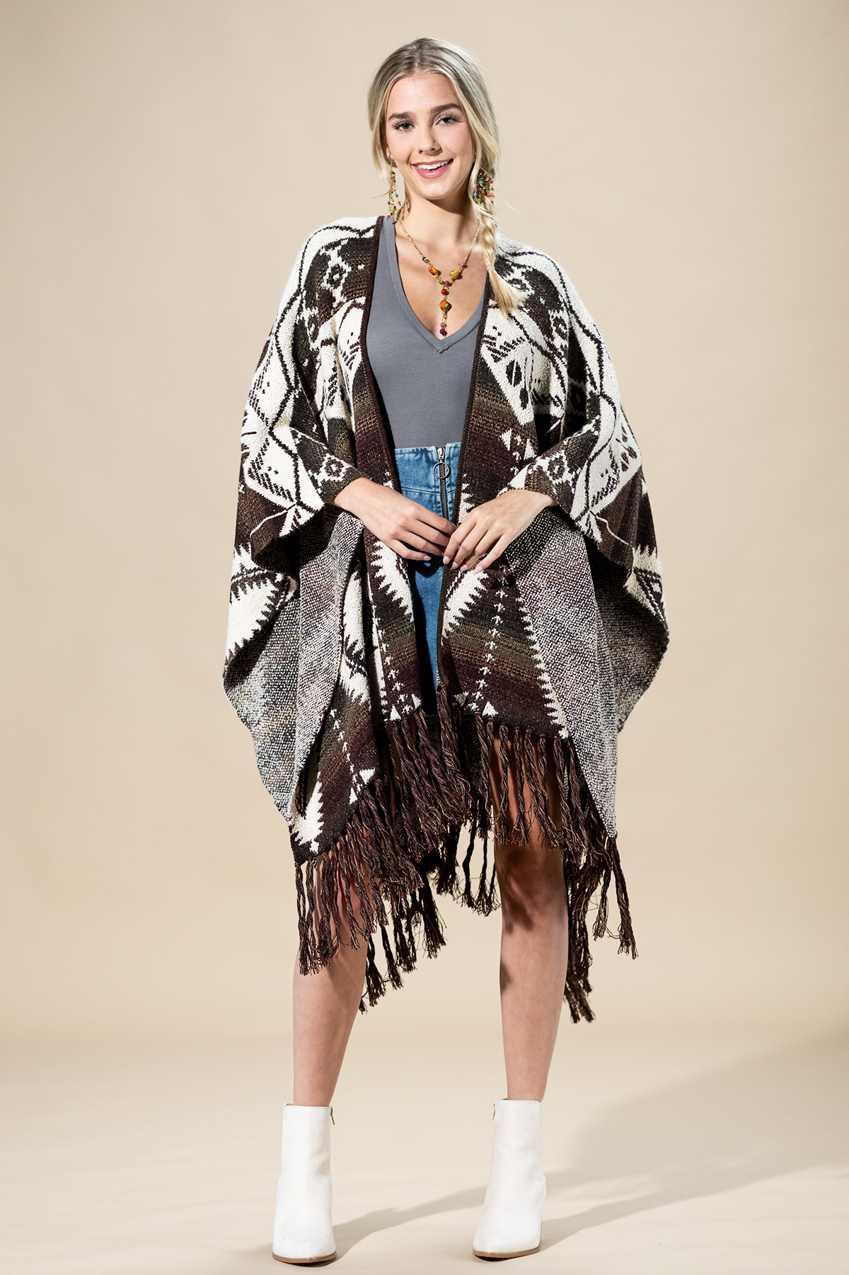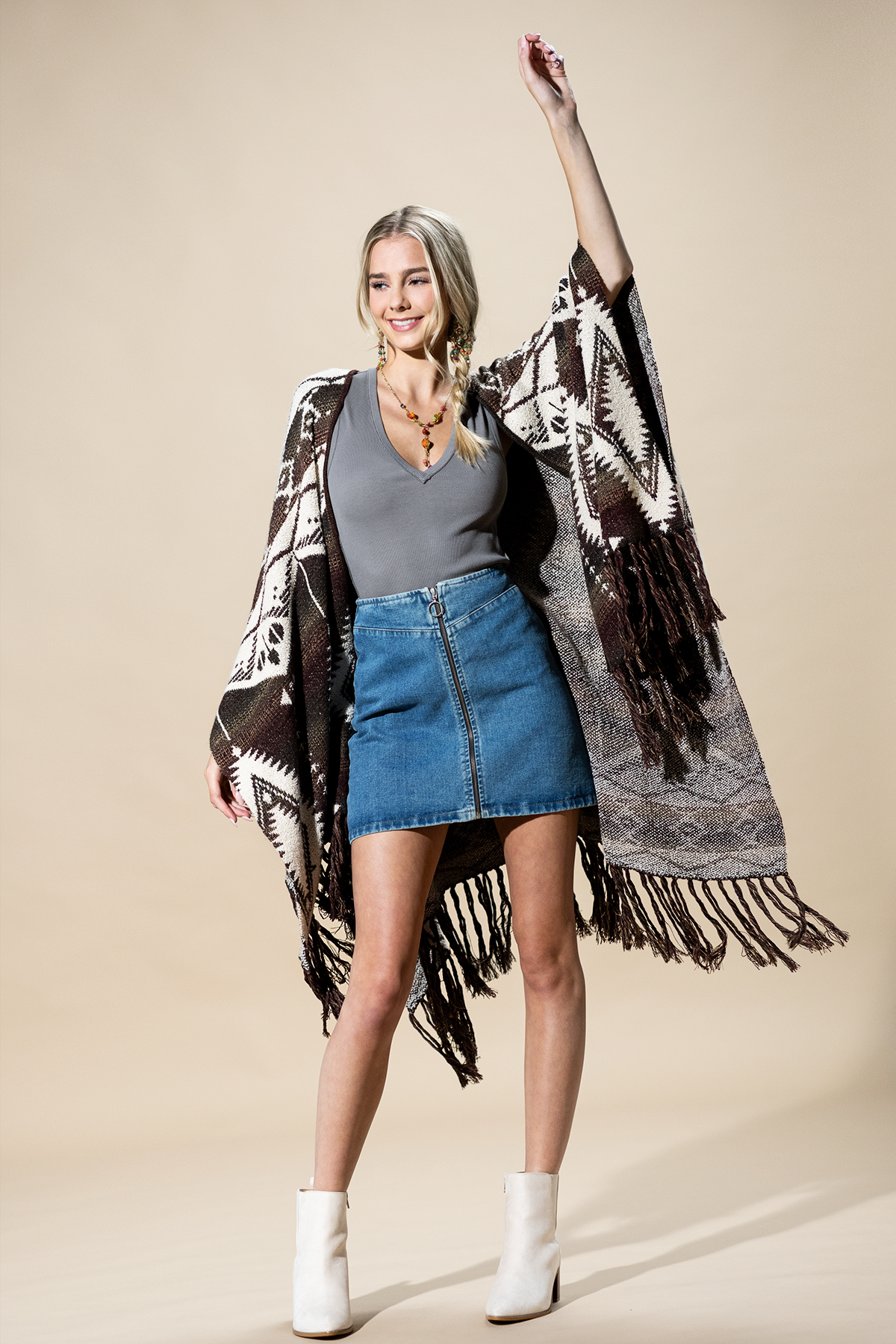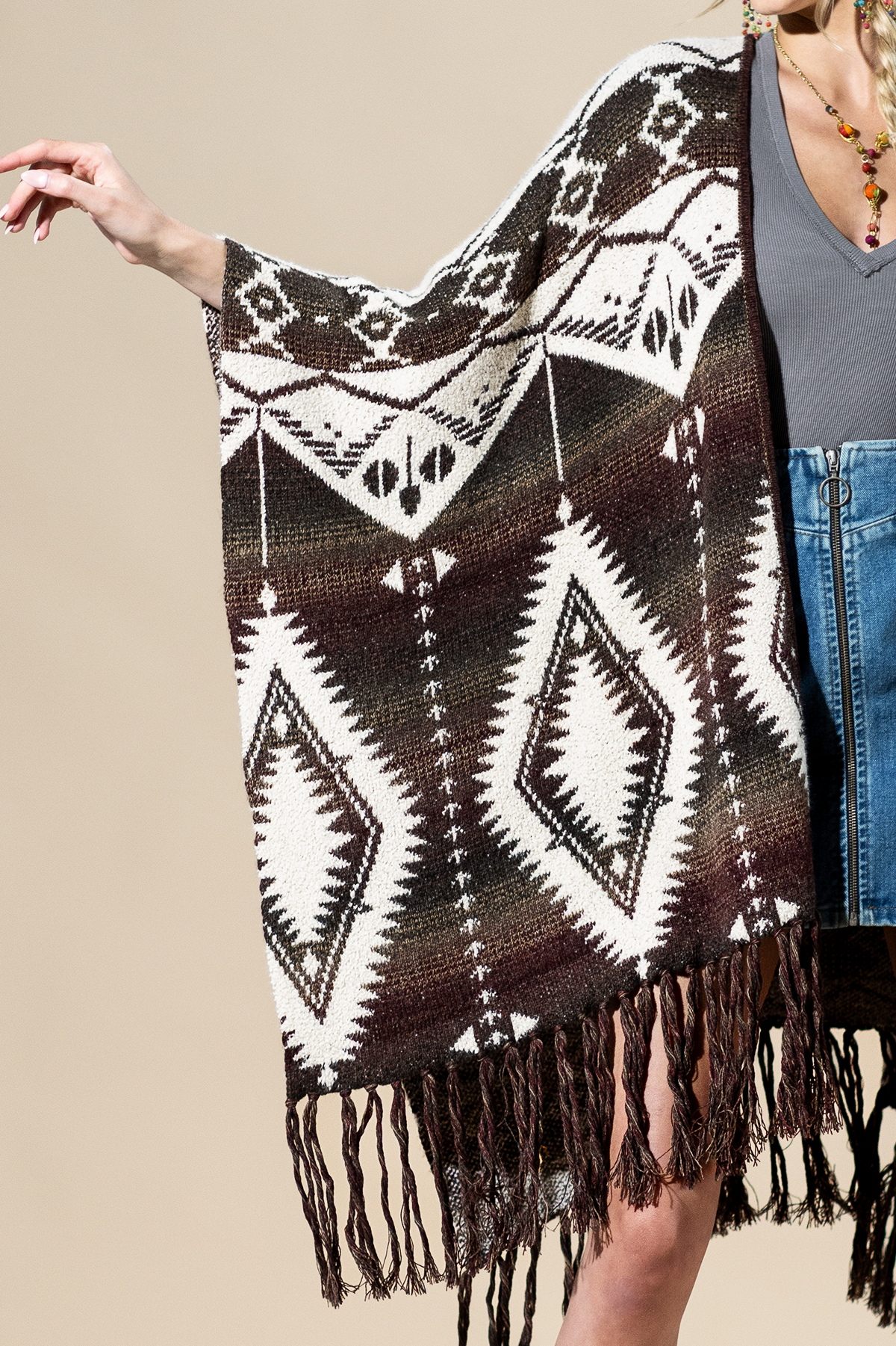 A woven ode to the Southwest. The Desert Dusk Ruana blends clay red, sand, and deep espresso tones into a soft, textural layer that feels like sunset over canyon stone. With its fringed hem and timeless geometric pattern, it captures the spirit of open skies and golden horizons.