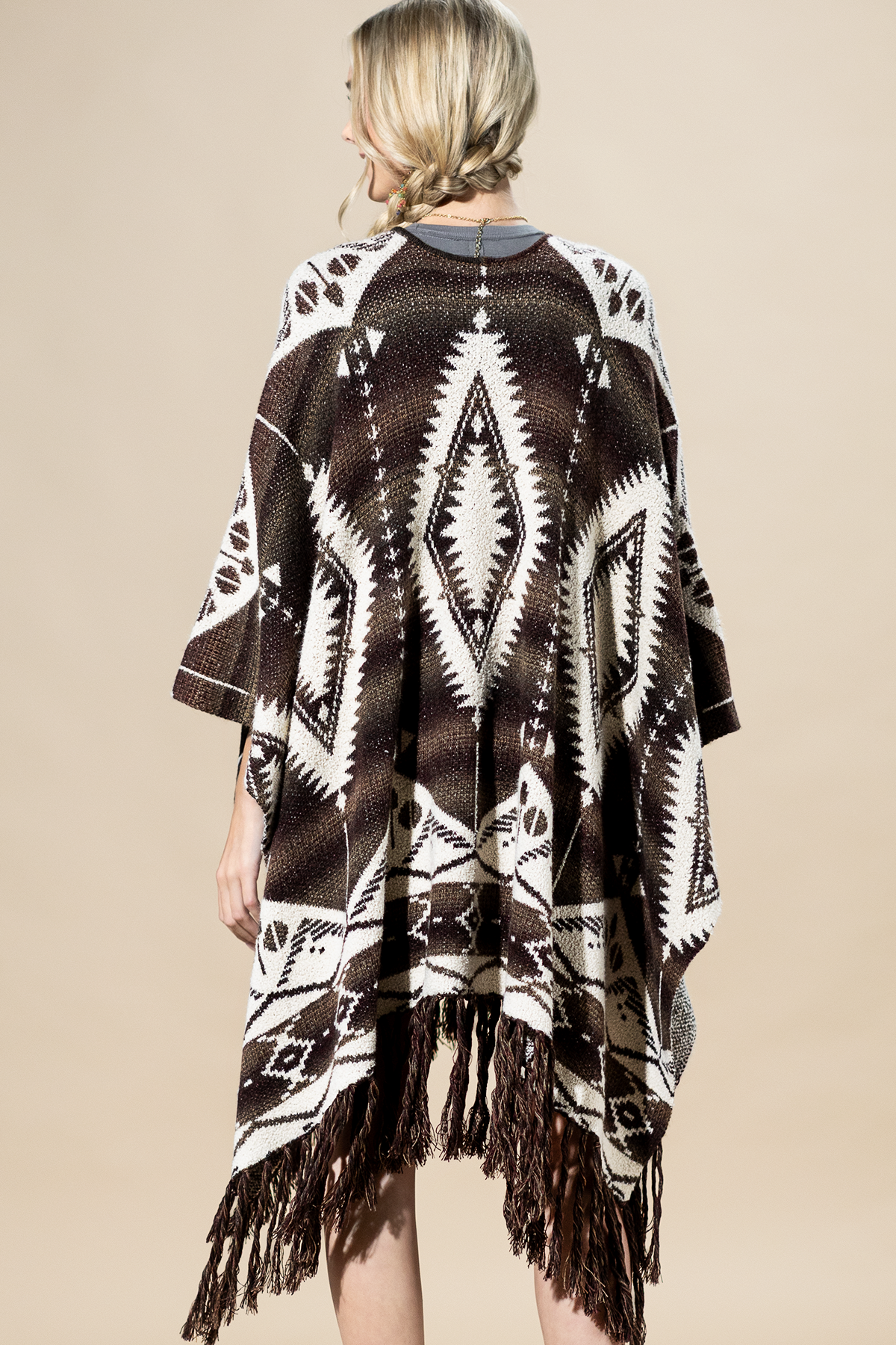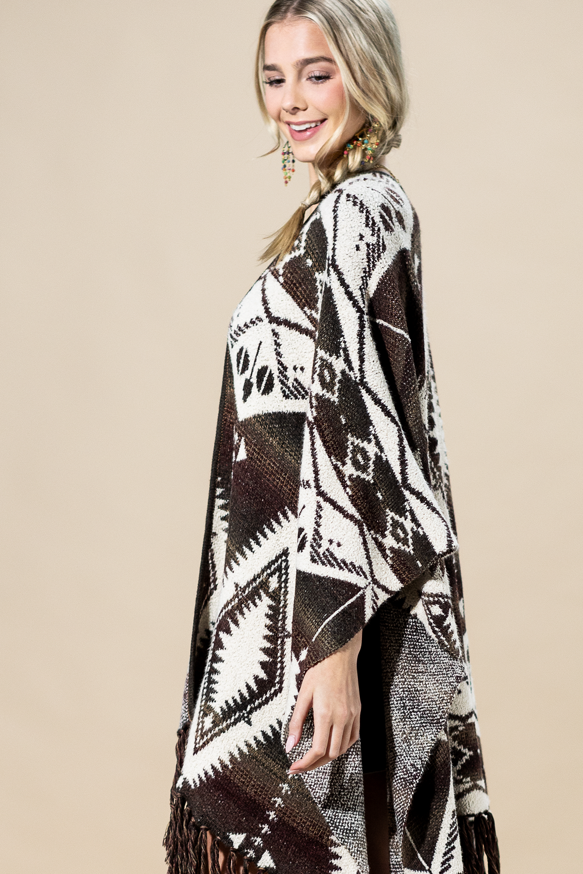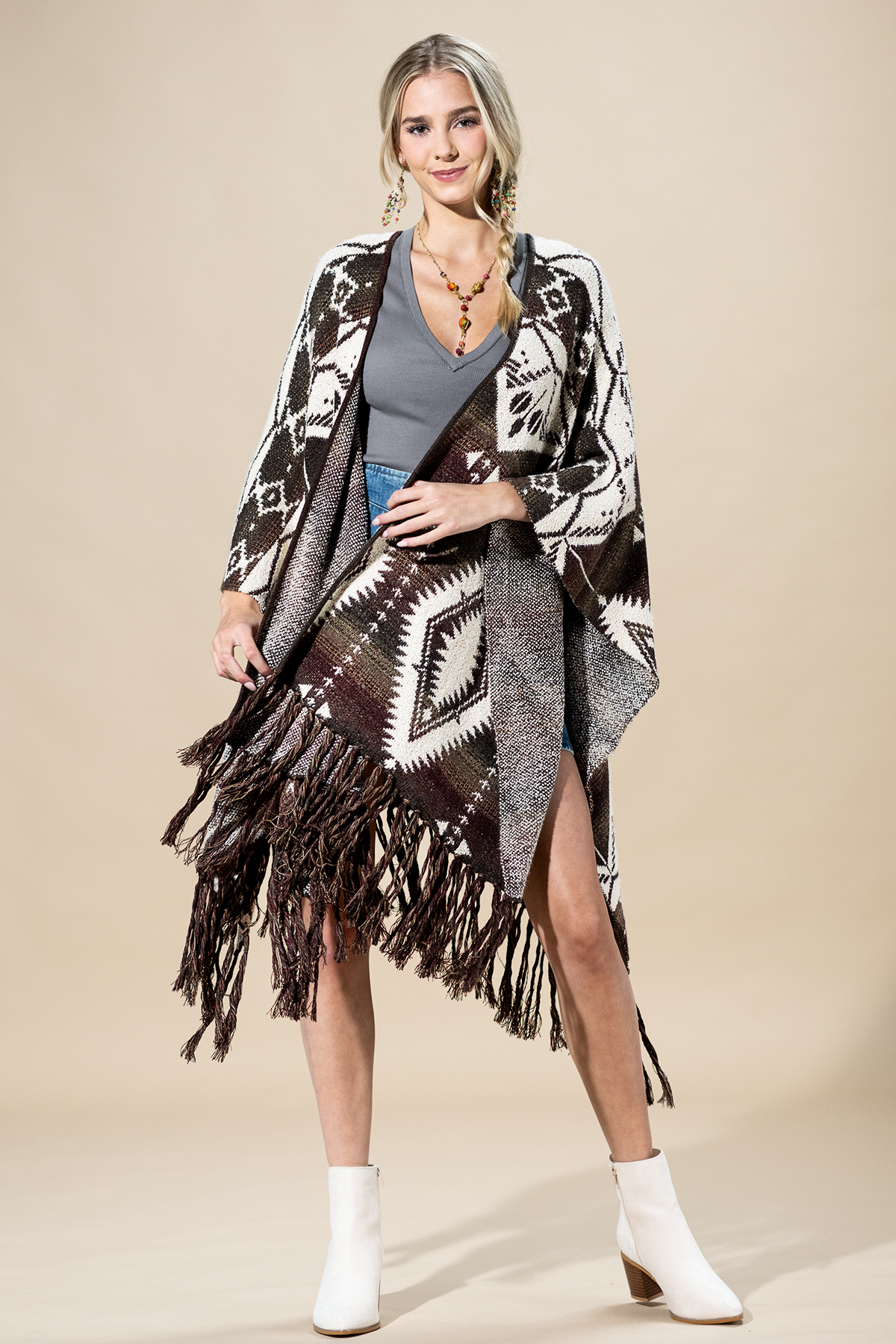 A woven ode to the Southwest. The Desert Dusk Ruana blends clay red, sand, and deep espresso tones into a soft, textural layer that feels like sunset over canyon stone. With its fringed hem and timeless geometric pattern, it captures the spirit of open skies and golden horizons.