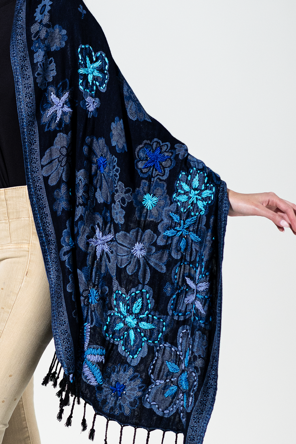 Cool, bold, and beautifully detailed. The Anchorage Wool Embroidered Scarf features hand-stitched floral embroidery layered over a softly woven base, creating depth and contrast through intricate craftsmanship. Finished with knotted fringe, it’s a modern expression of artisan design — striking, textured, and made for crisp air and city lights.