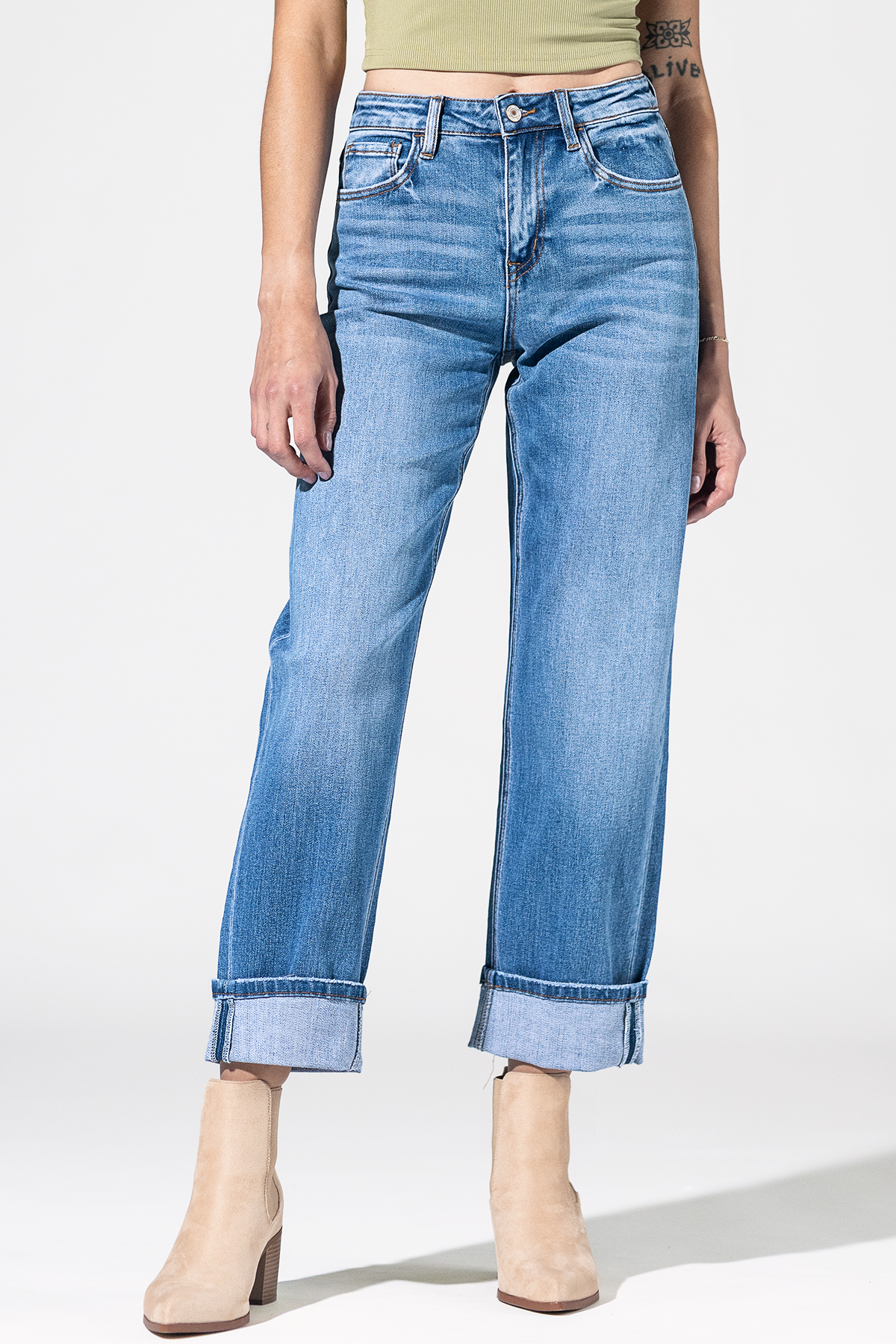 A true go-to with a relaxed barrel-leg fit, structured high rise, and wide cuffed hems. Made from durable mid-wash denim with light fading, they’re perfect for pairing with boots, sandals, or sneakers. Comfortable, classic, and full of character