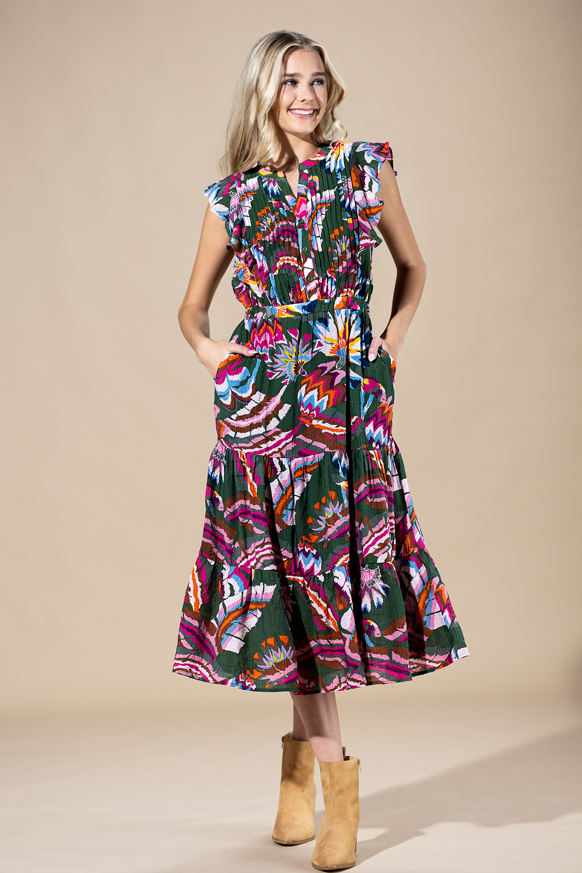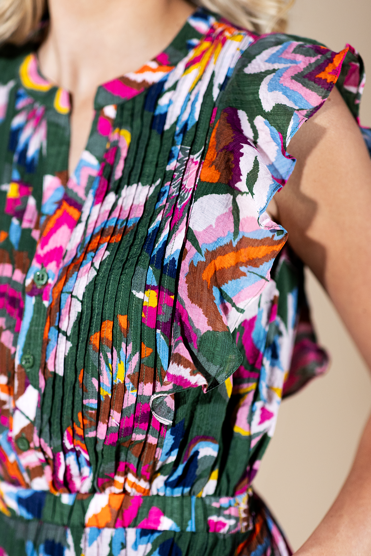 Sun-kissed color meets effortless charm. This features a lush green base bursting with painterly florals in pink, blue, and purple. A tropical garden at golden hour. Designed with a smocked waist and soft ruffle sleeves, it flatters every curve while keeping things light, breezy, and ready for adventure.