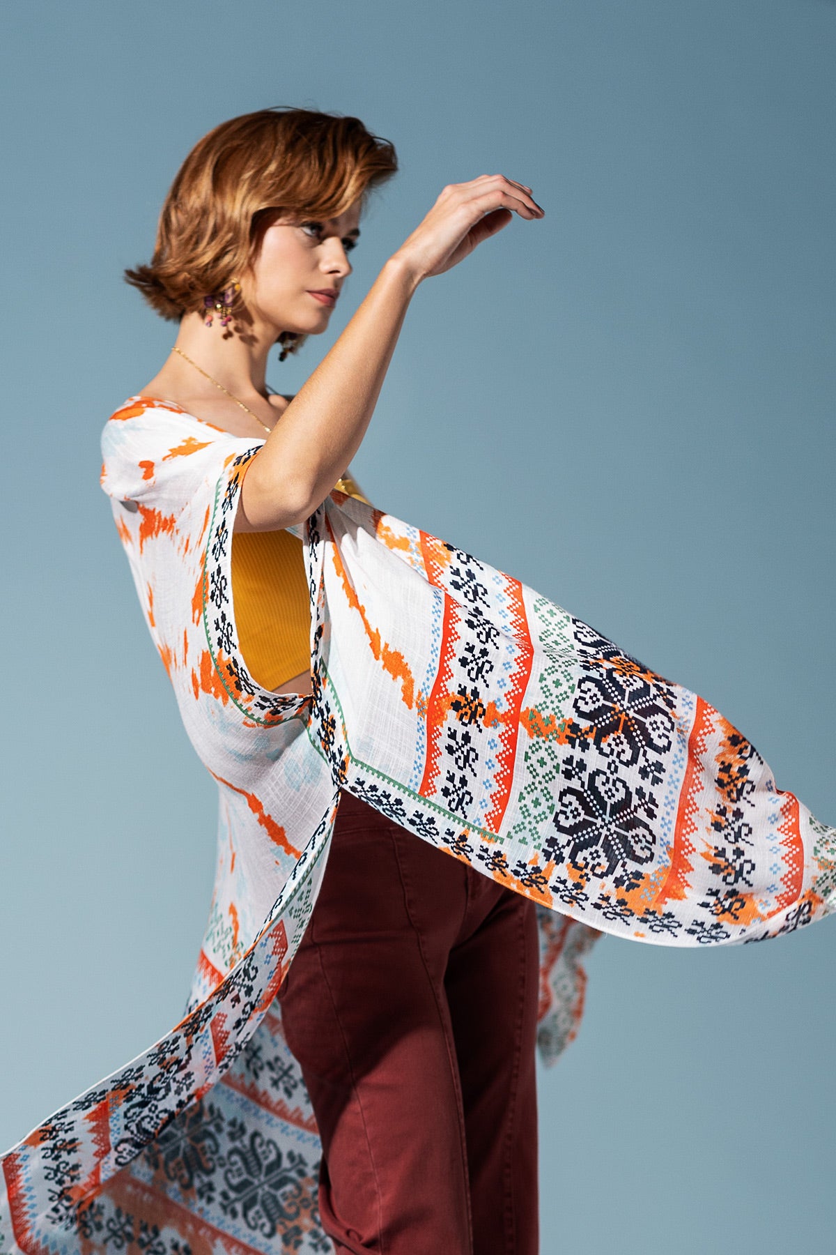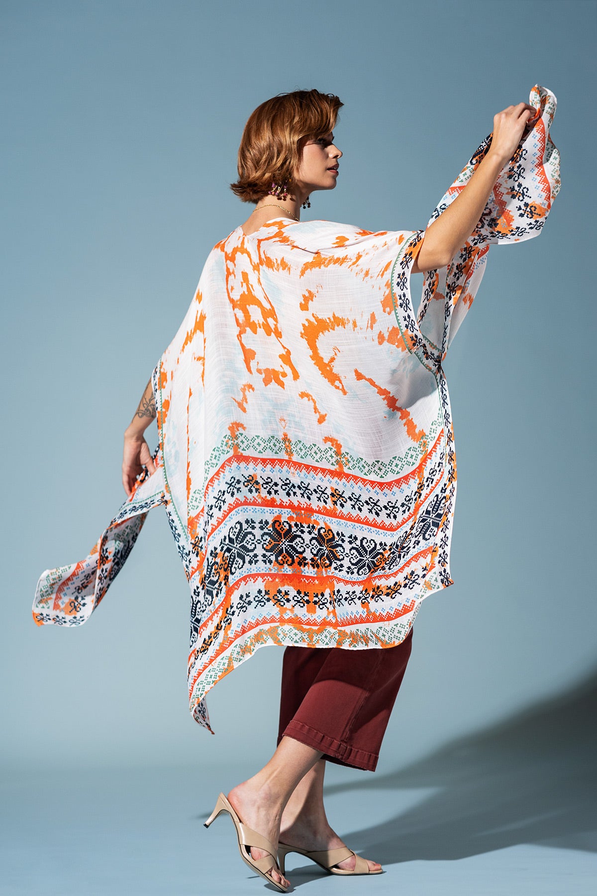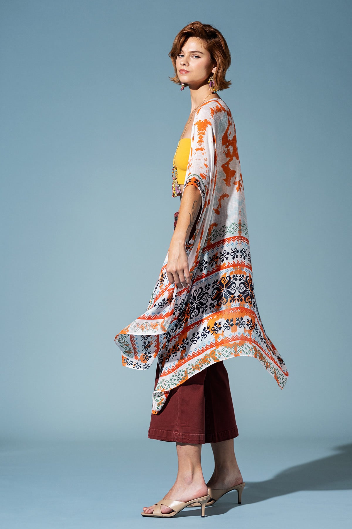 Step out in the Boho Breeze Print Kimono, a vibrant celebration of bohemian artistry. Its flowy silhouette is adorned with a lively ethnic print, featuring a mix of patterns and a subtle shadow print effect, bordered for a chic, defined look.