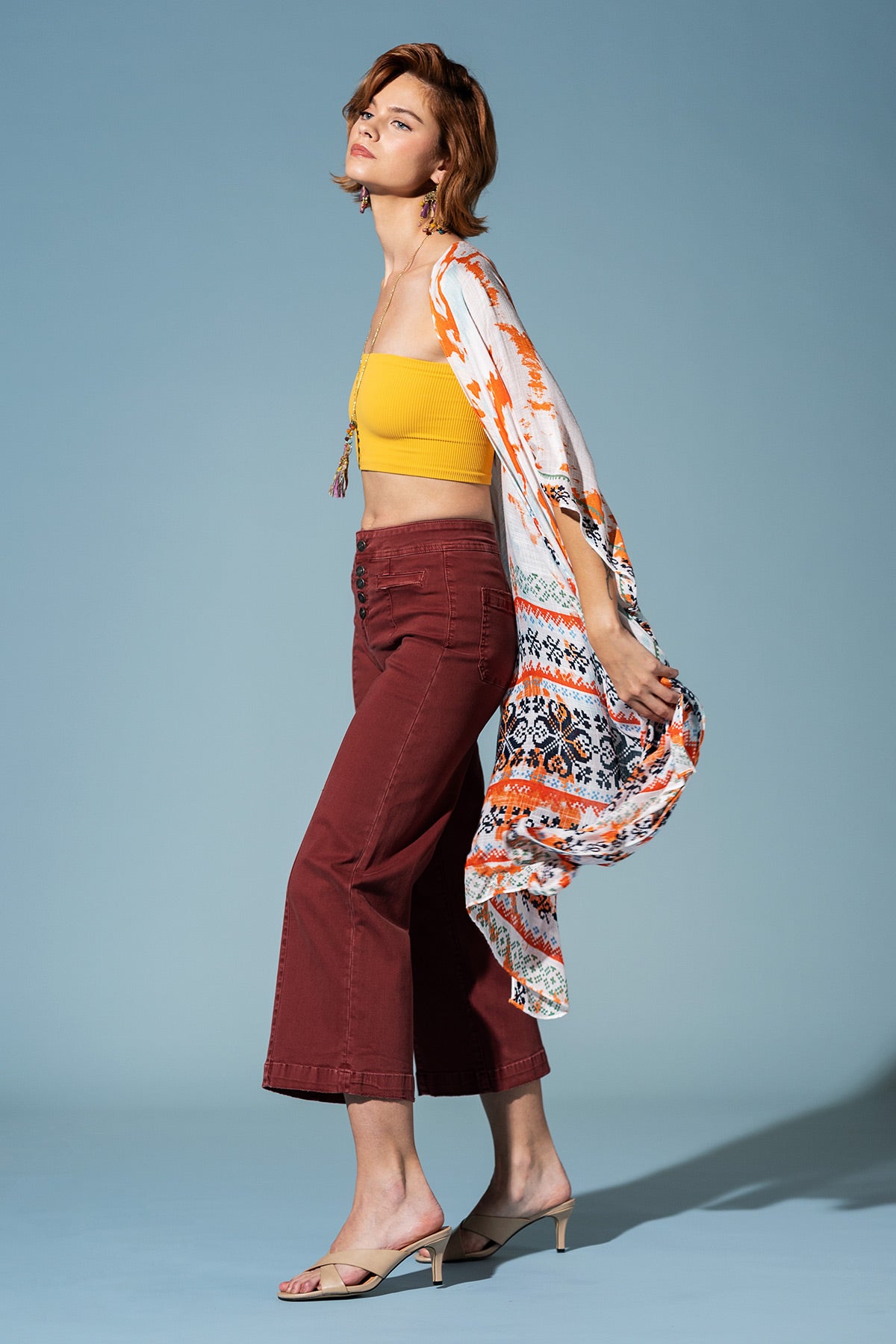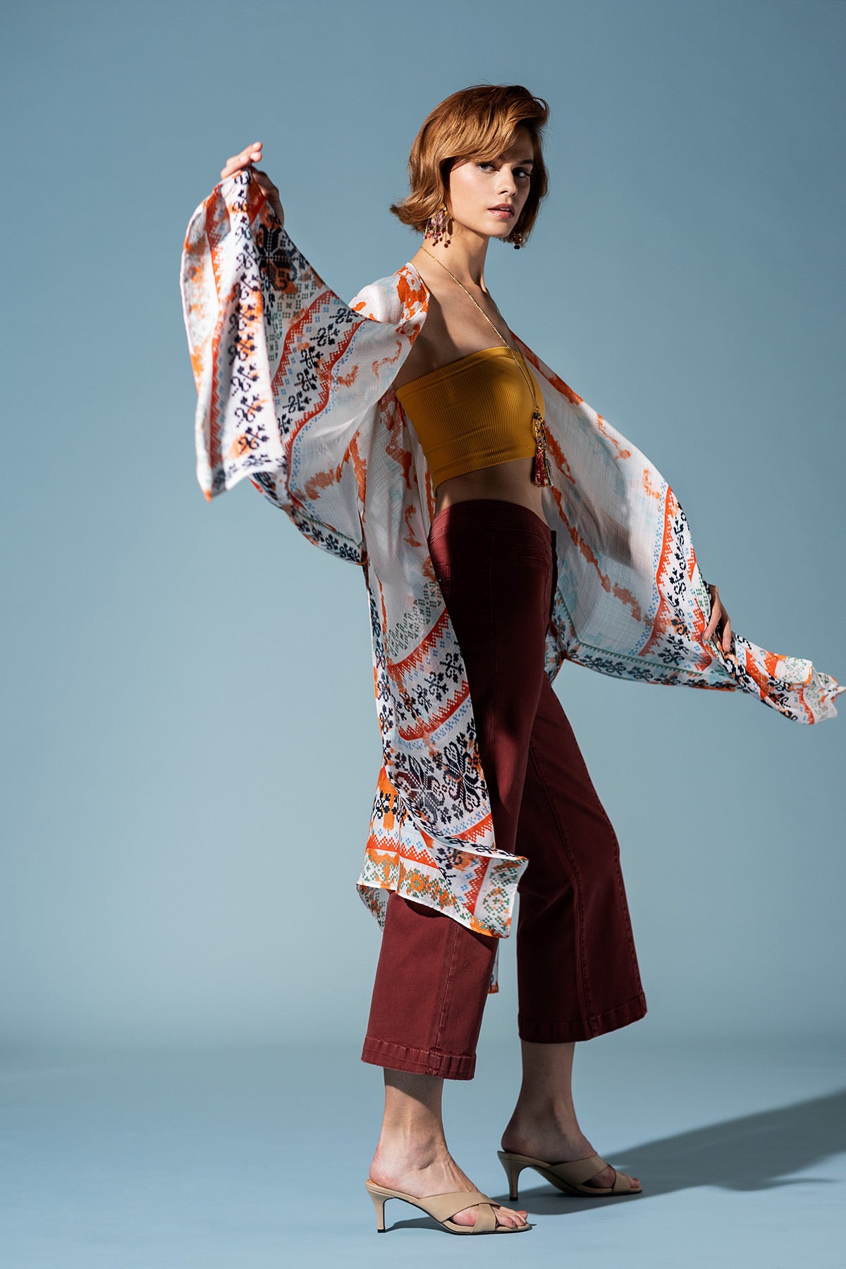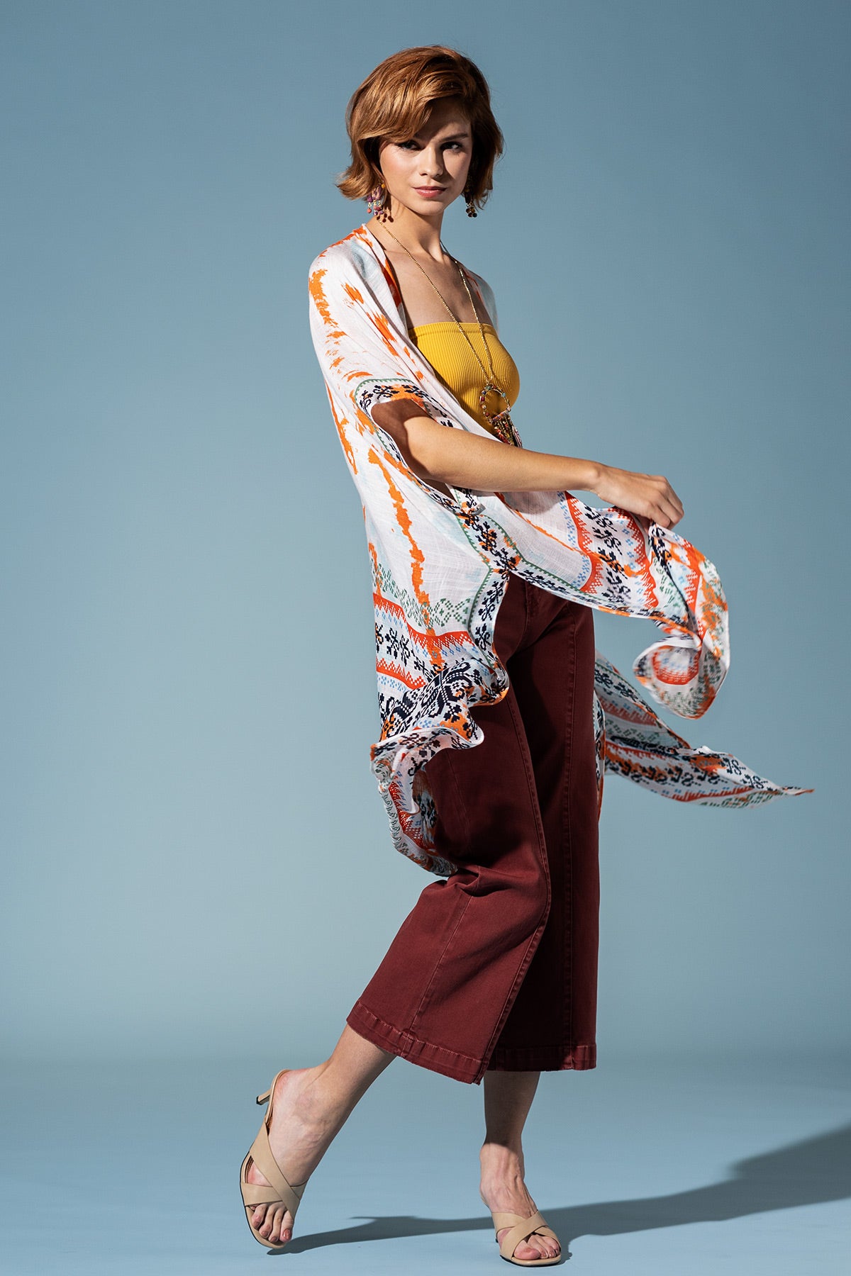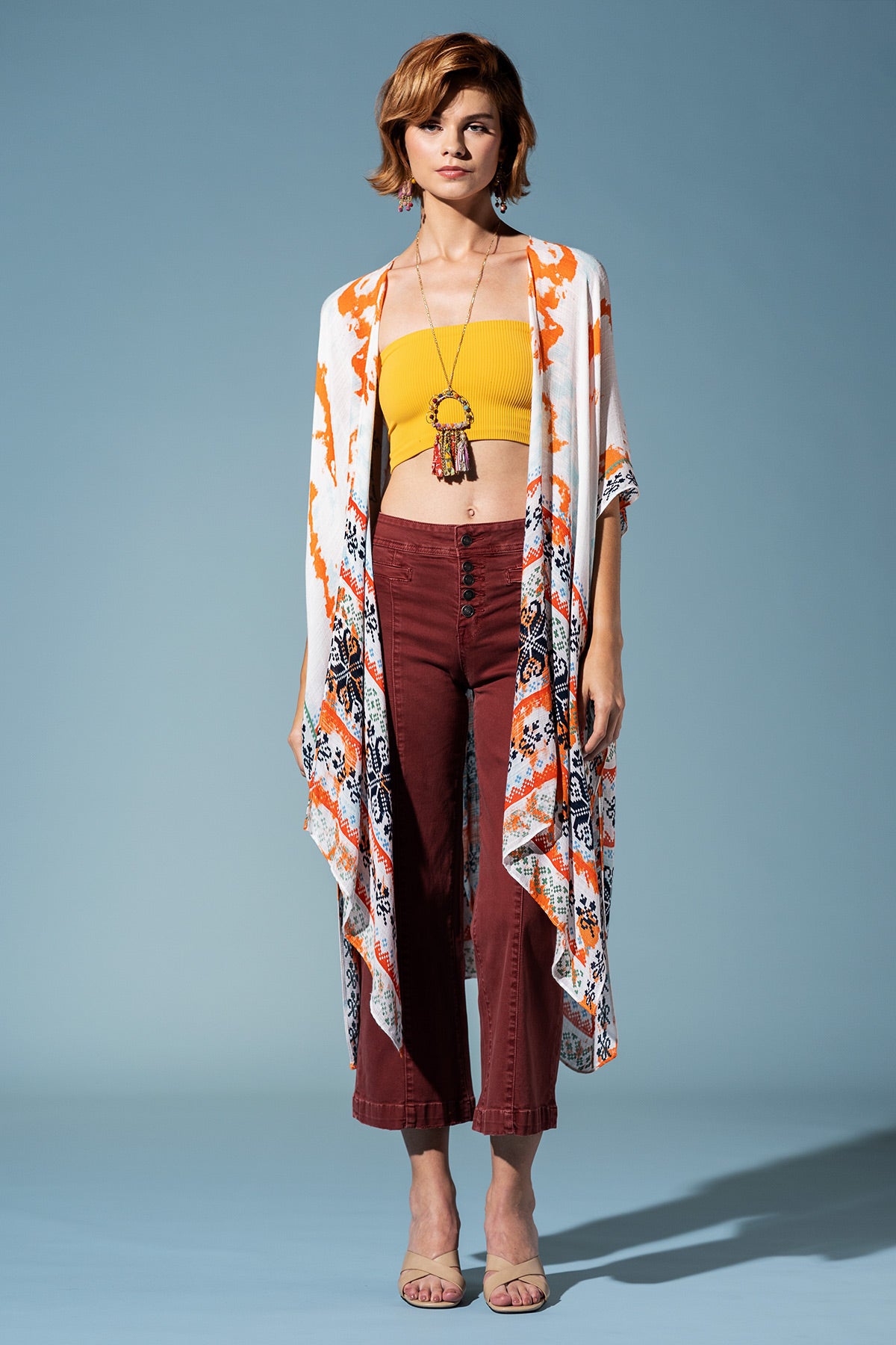 Step out in the Boho Breeze Print Kimono, a vibrant celebration of bohemian artistry. Its flowy silhouette is adorned with a lively ethnic print, featuring a mix of patterns and a subtle shadow print effect, bordered for a chic, defined look.