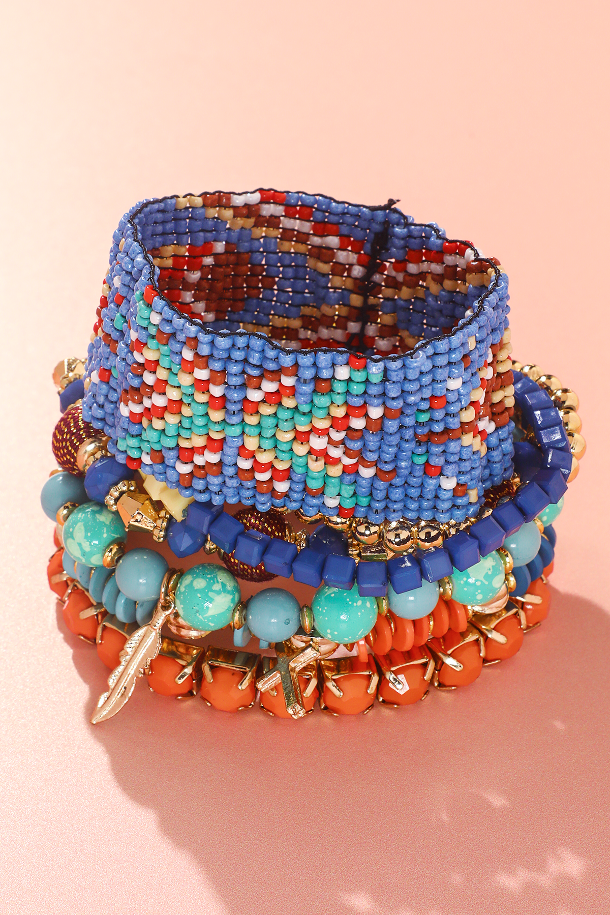 A bold tapestry of colors and textures. This handcrafted bracelet stack mixes seed beads, charms, and vibrant materials for a look that’s retro, radiant, and impossible to ignore.