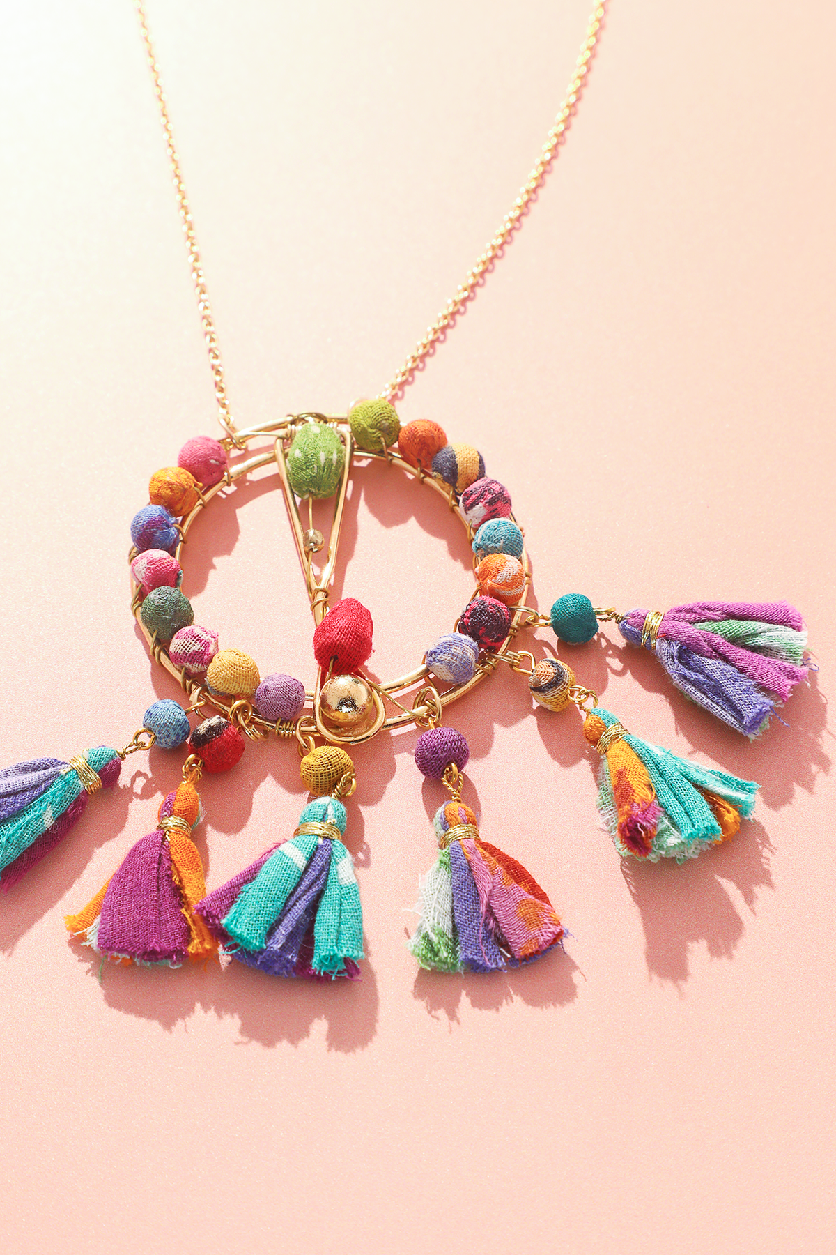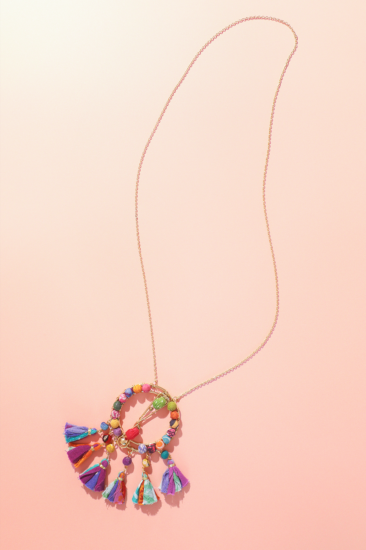 Vibrant handmade ring necklace adorned with playful tassels—crafted from upcycled sari textiles for a bold, stylish touch. Crafted with care and sustainability in mind, our accessories showcase the beauty of upcycled Sari textiles. Each piece tells a unique story, born from the vibrant traditions of Indian craftsmanship and lovingly handcrafted by skilled women artisans. Every bead and fabric element is one-of-a-kind, ensuring that no two accessories are exactly alike. Due to the nature of repurposed materials, each item features its own distinct blend of colors and patterns, from the individual beads to the fabric components. This variation is not just a feature, but a celebration of authenticity and eco-conscious design. By choosing our accessories, you support both environmental responsibility and the empowerment of women artisans in India, while embracing a truly unique piece of wearable art.
