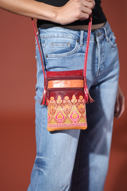 Bold, hand painted, and beautifully embossed, this genuine leather cellphone bag channels a global spirit with a luxe twist. The rich crimson base is balanced with vibrant patterns and sleek tassel details. Perfect for your next market stroll, concert night, or weekend escape.