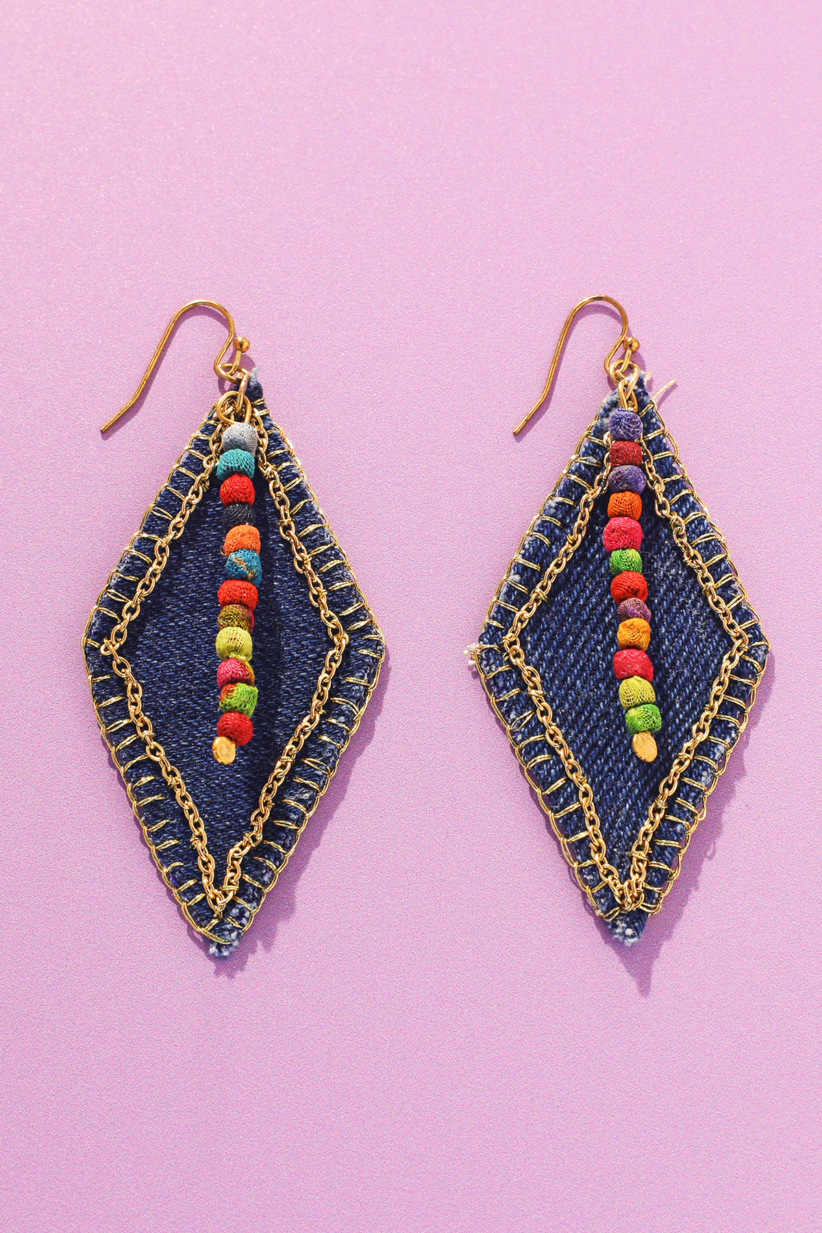 These fresh handmade denim diamond-shaped earrings make a bold statement with their unique texture and eye-catching silhouette. Lightweight yet striking, they blend modern design with vintage-inspired charm for an effortlessly cool look.