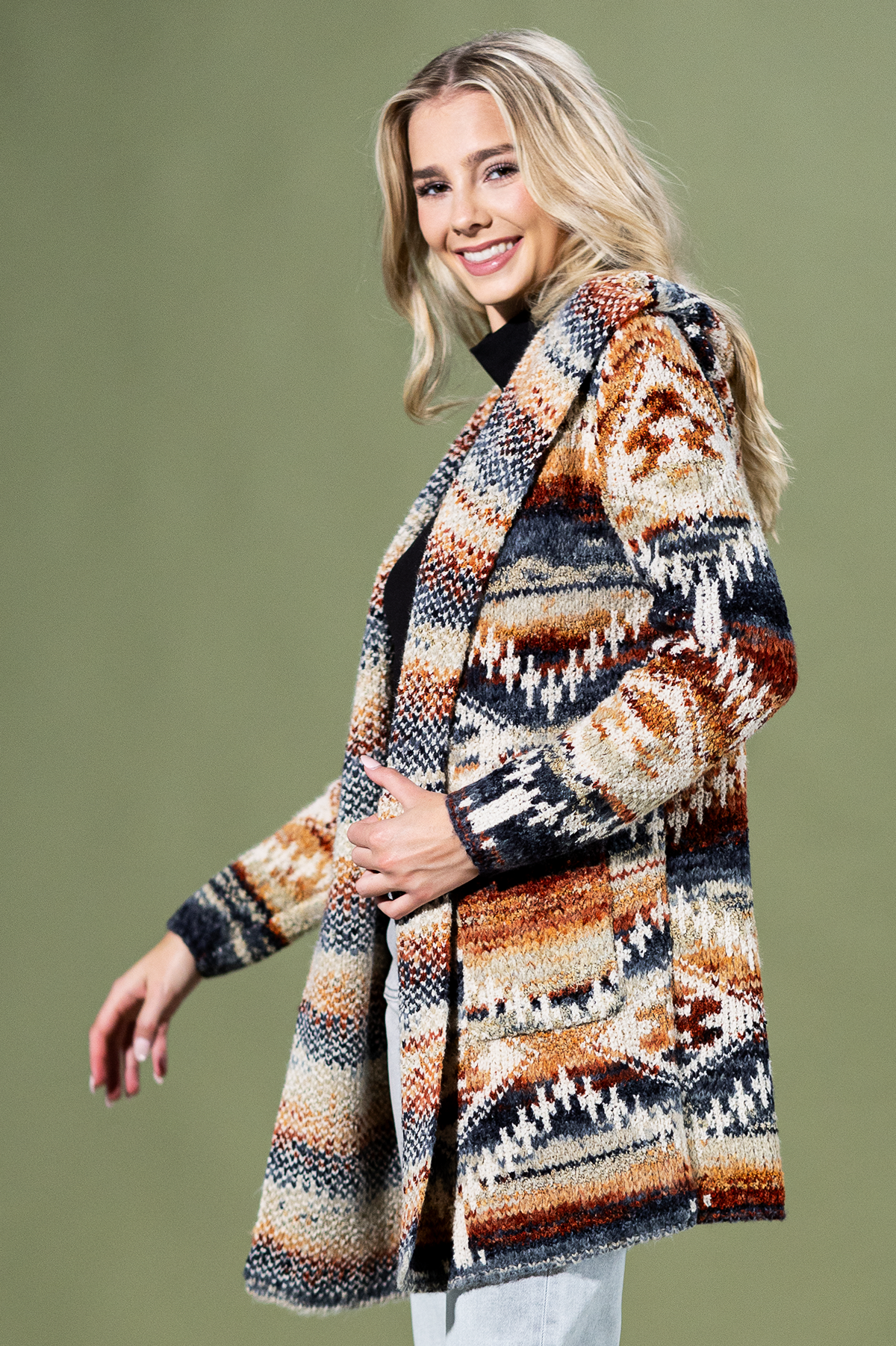 Like morning light spilling over canyon ridges, this hooded cardigan blends warm shades of rust, sand, and indigo into a cozy, textured layer that feels both rugged and refined. The hooded silhouette and front pockets make it an easy, everyday favorite. Perfect for crisp desert mornings, road trips, or lazy weekends wrapped in warmth.