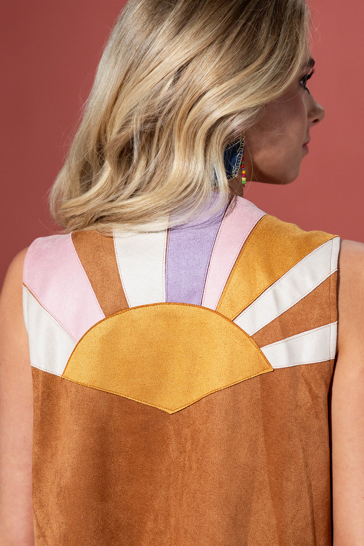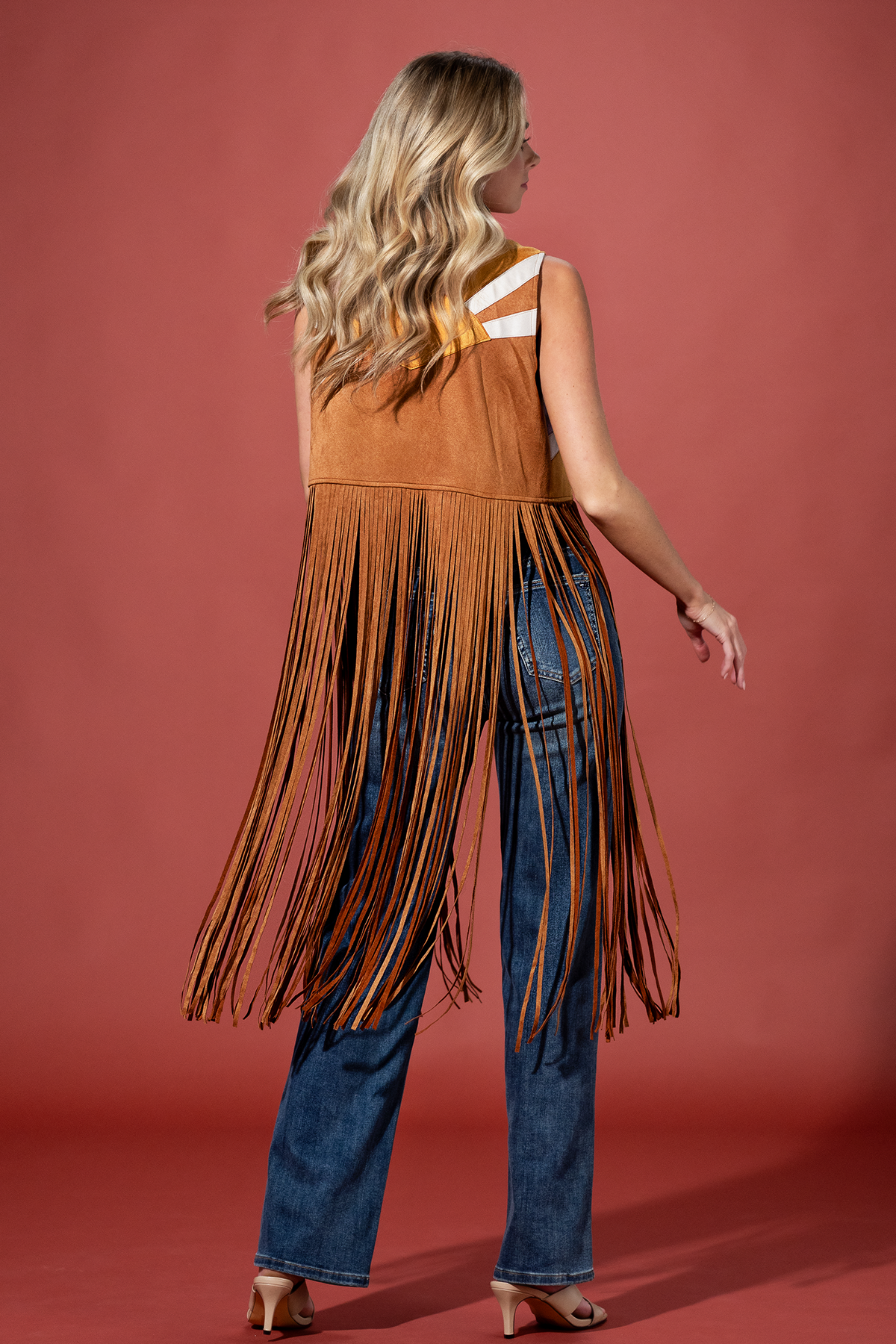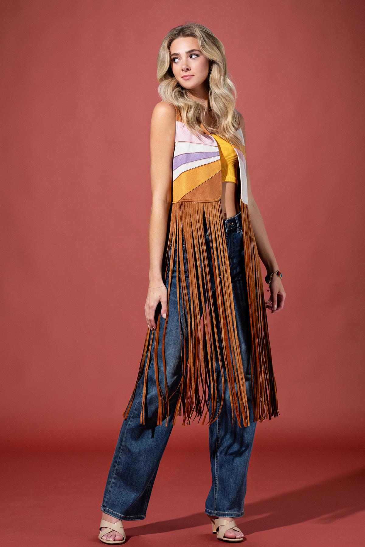 Loud, proud, and not here for subtle. This statement vest throws it back with vibrant 70s color blocking, buttery suede, and tassels longer than your to-do list. Throw it on, and suddenly you're the headliner.