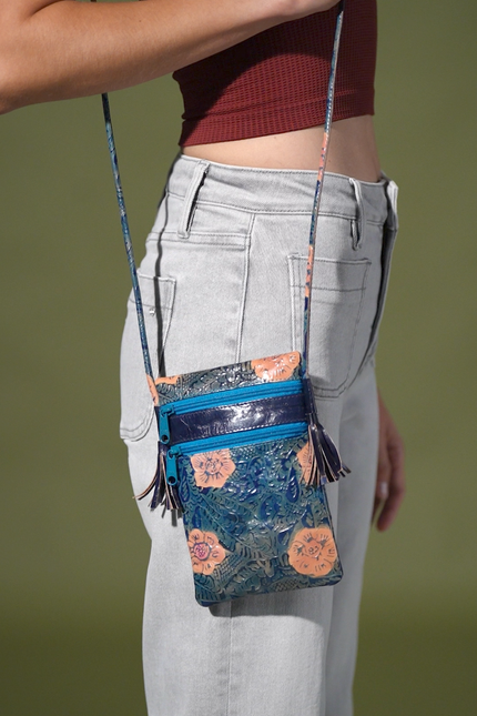 A striking hand-painted embossed genuine leather cellphone bag, featuring an intricate floral design and elegant tassel accents. Infused with Indian artistry, this unique piece blends traditional craftsmanship with modern functionality, offering a stylish way to carry your essentials with a touch of vibrant charm.