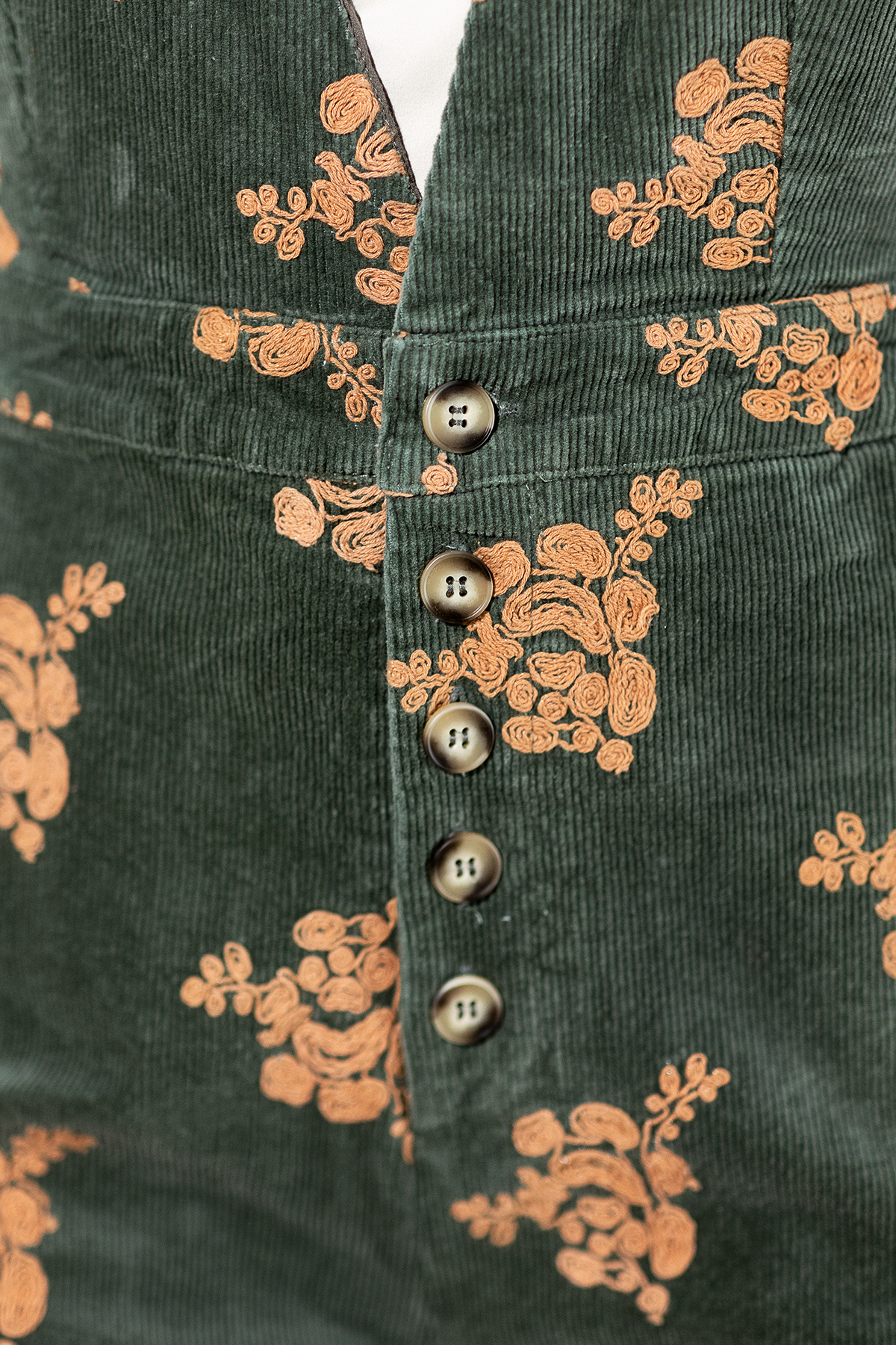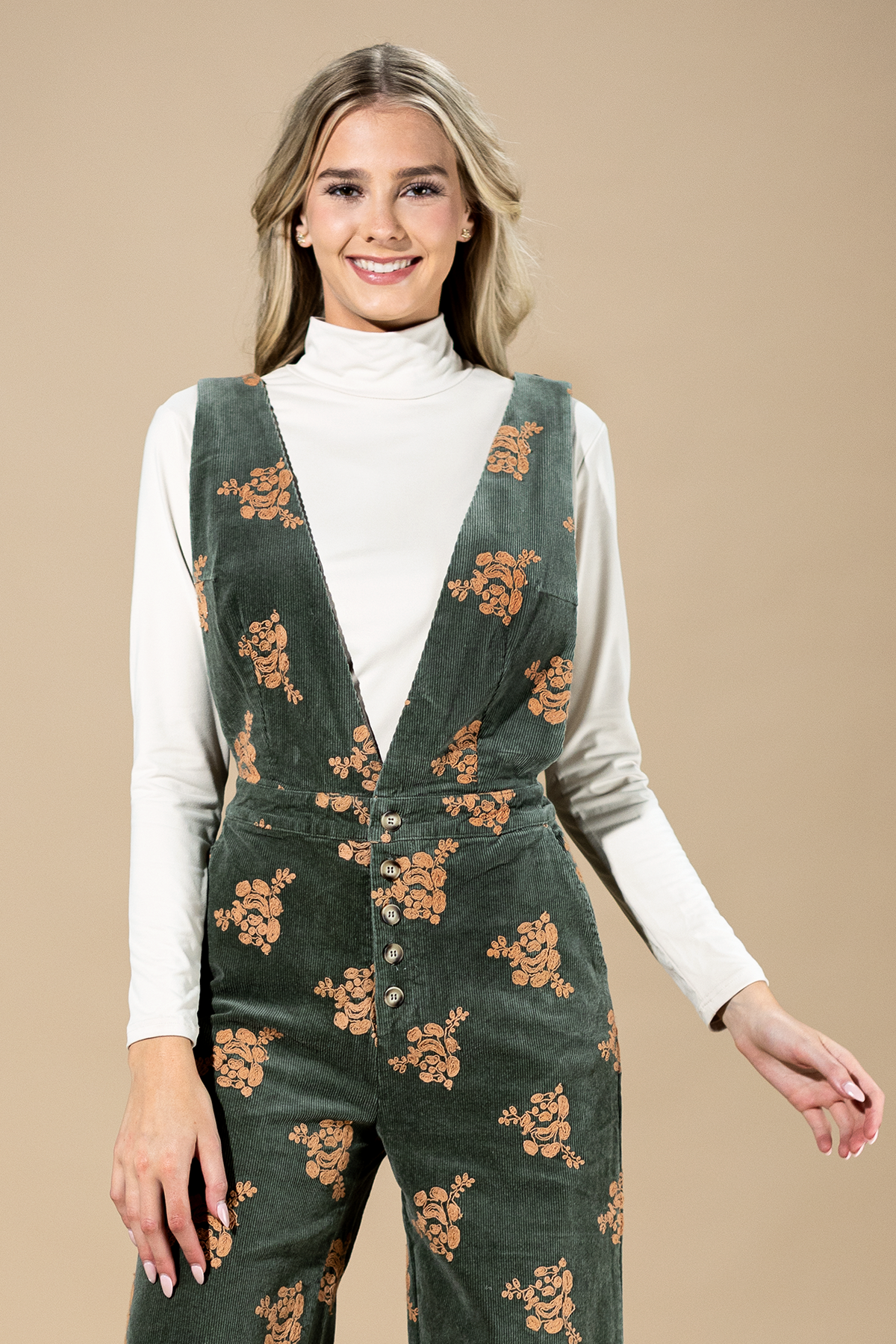 Soft corduroy meets timeless tailoring in this vintage-inspired one-piece. Featuring delicate embroidered florals, a flattering V-neck, and a button-down front, it blends nostalgic charm with an easy, modern fit.
