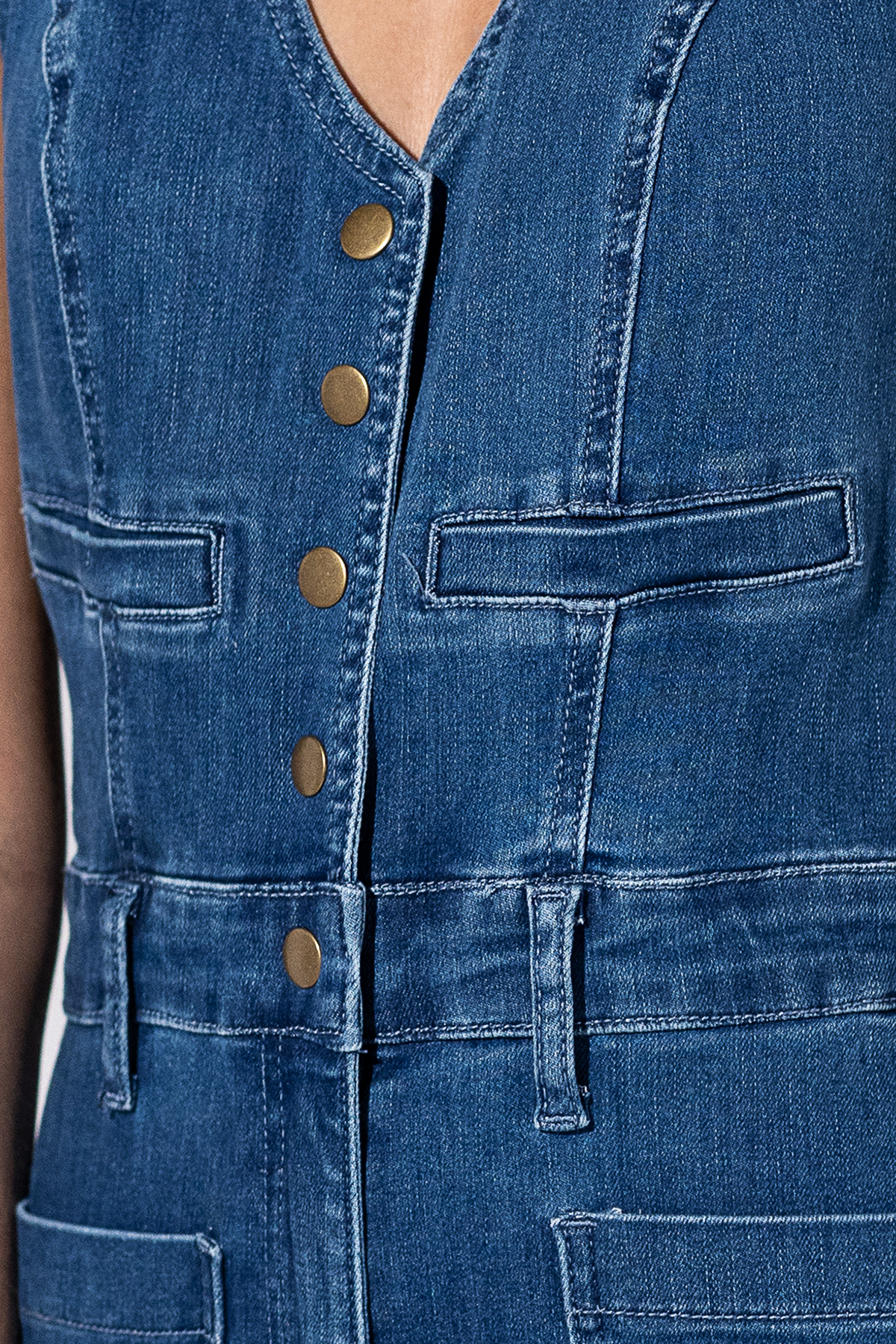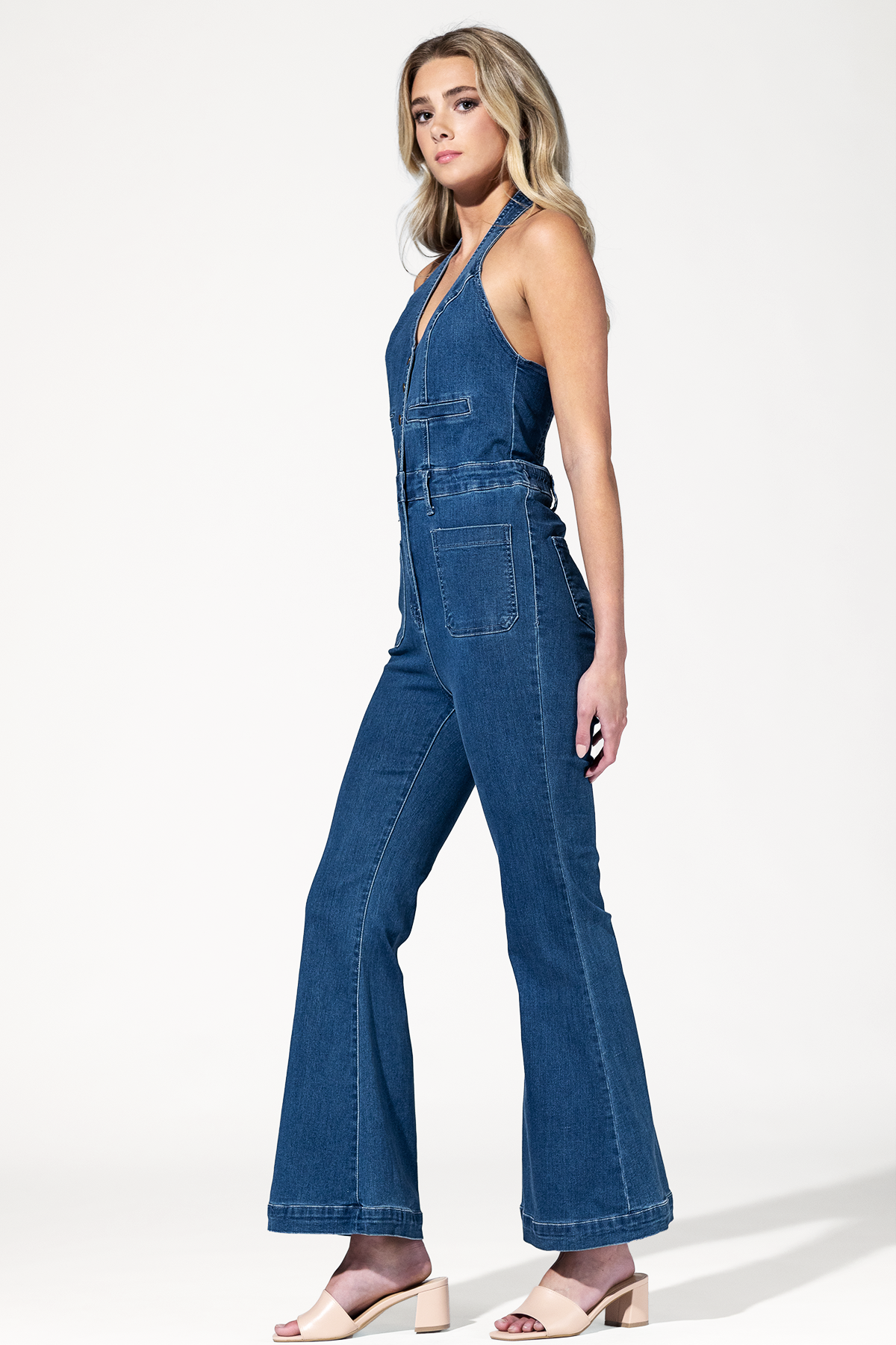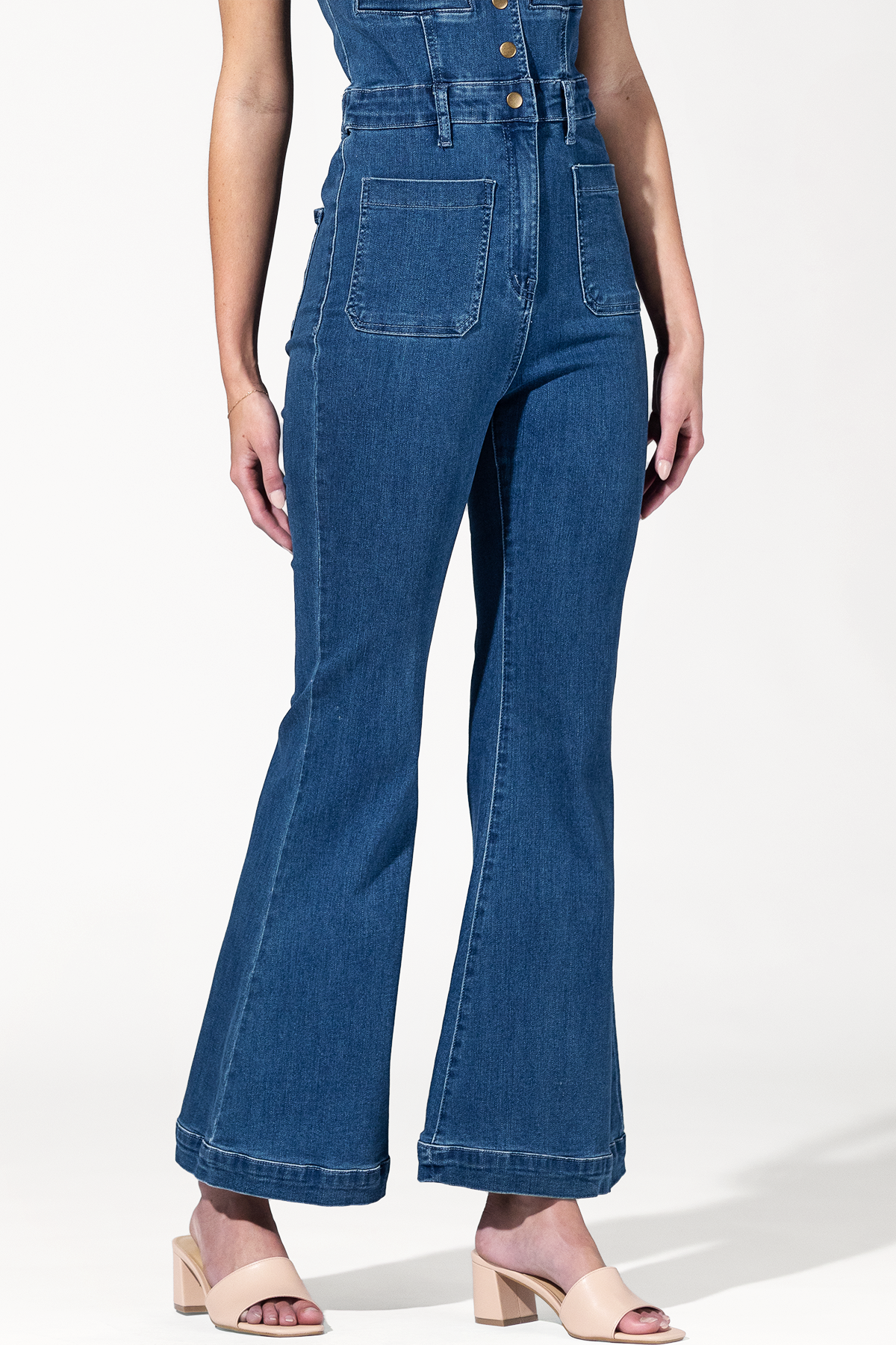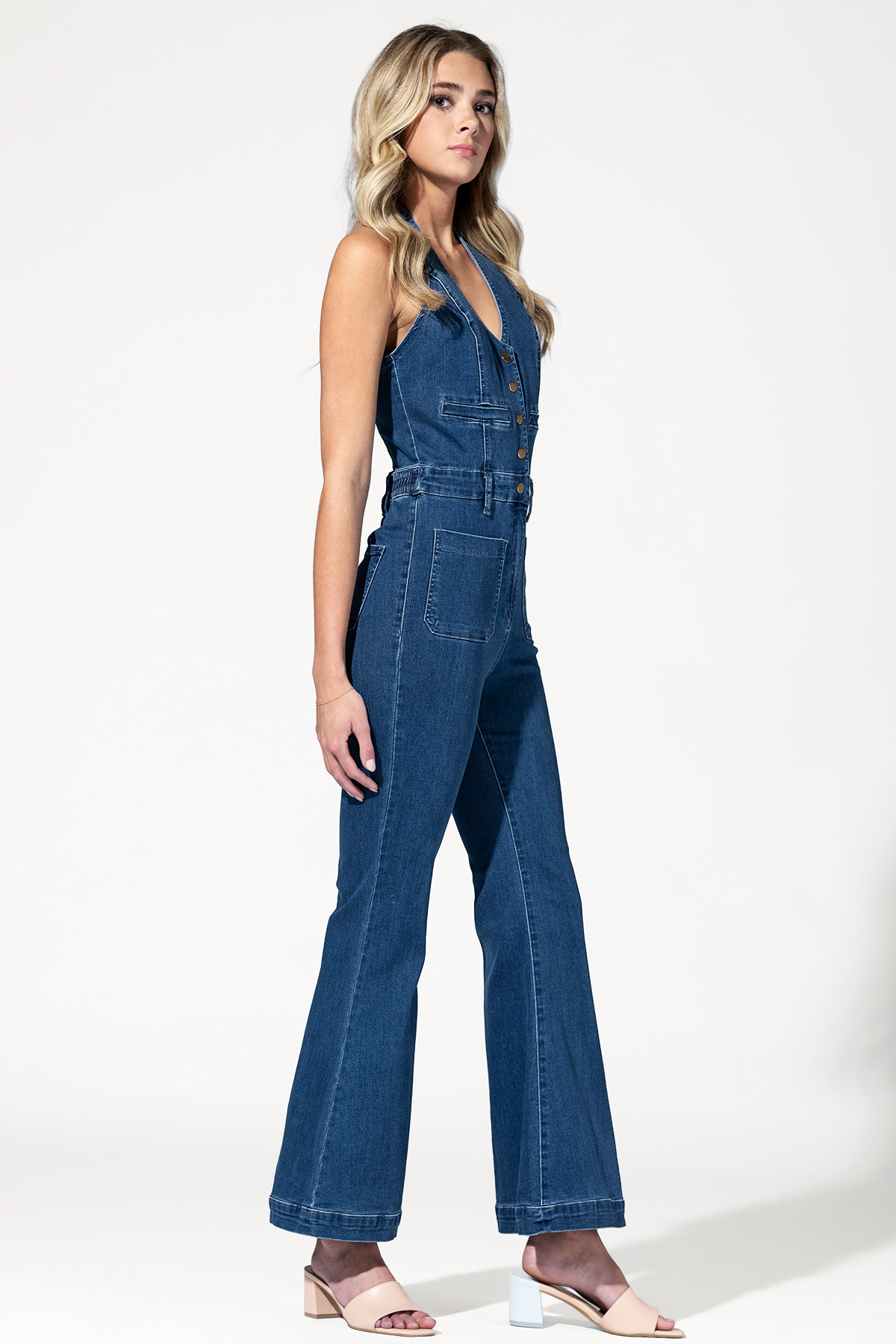 Retro glam, no effort required. This denim jumpsuit turns heads with bold buttons, flared legs, and a silhouette that hugs just right. Made for dance floors, disco lights, and any moment you want to own.