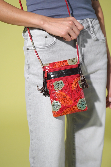 The Fiery Flora Cellphone Bag is a blend of artisanal craftsmanship and vintage allure. Hand-painted on genuine leather, it showcases intricately embossed floral motifs with timeless appeal. Designed with tassel zipper pullers for a playful touch, this compact yet statement-making bag features a secure zip closure and lined interior, ensuring both style and function. Effortlessly chic and versatile, it's the perfect companion for any outing.