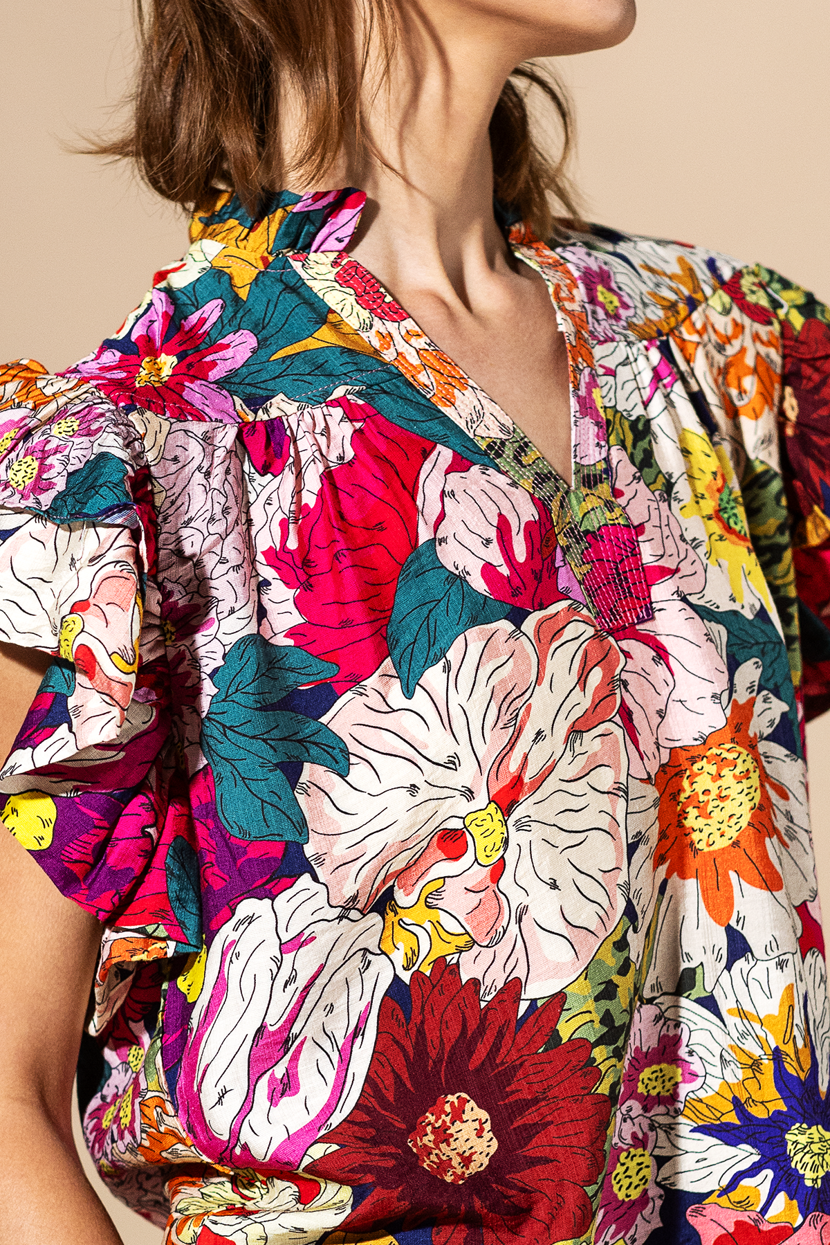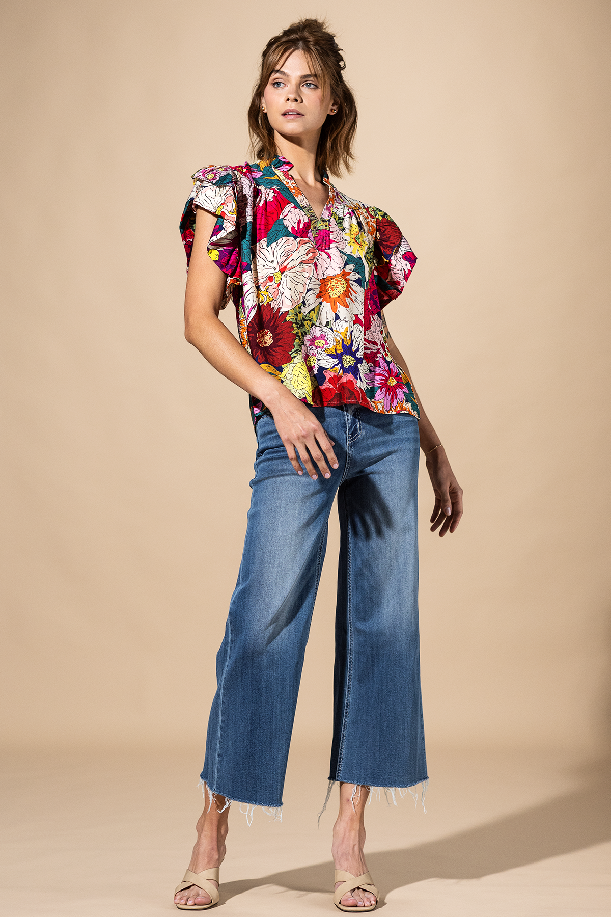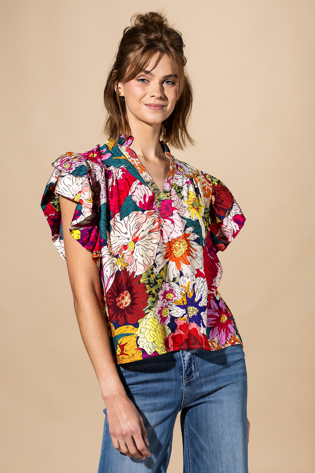 Bright, bold, and unapologetically fun. This blouse is made to turn heads. Featuring vivid oversized florals and flirty flutter sleeves, this piece blends retro flair with a fresh, modern edge. It’s a wearable celebration of color, confidence, and creativity.