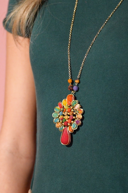 Timeless long chain-link necklace featuring an ornate fabric-beaded pendant—crafted for a perfect balance of artistry and elegance. Crafted with care and sustainability in mind, our accessories showcase the beauty of upcycled Sari textiles. Each piece tells a unique story, born from the vibrant traditions of Indian craftsmanship and lovingly handcrafted by skilled women artisans. Every bead and fabric element is one-of-a-kind, ensuring that no two accessories are exactly alike. Due to the nature of repurposed materials, each item features its own distinct blend of colors and patterns, from the individual beads to the fabric components. This variation is not just a feature, but a celebration of authenticity and eco-conscious design. By choosing our accessories, you support both environmental responsibility and the empowerment of women artisans in India, while embracing a truly unique piece of wearable art.