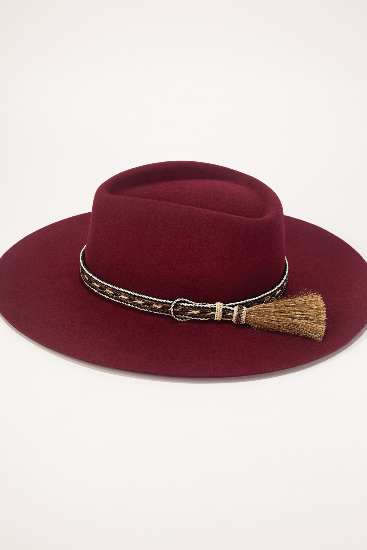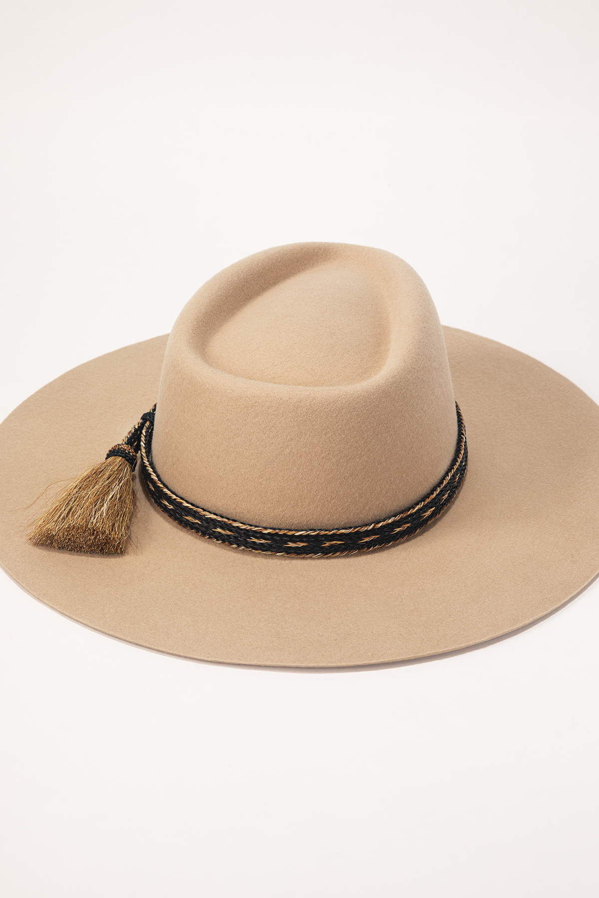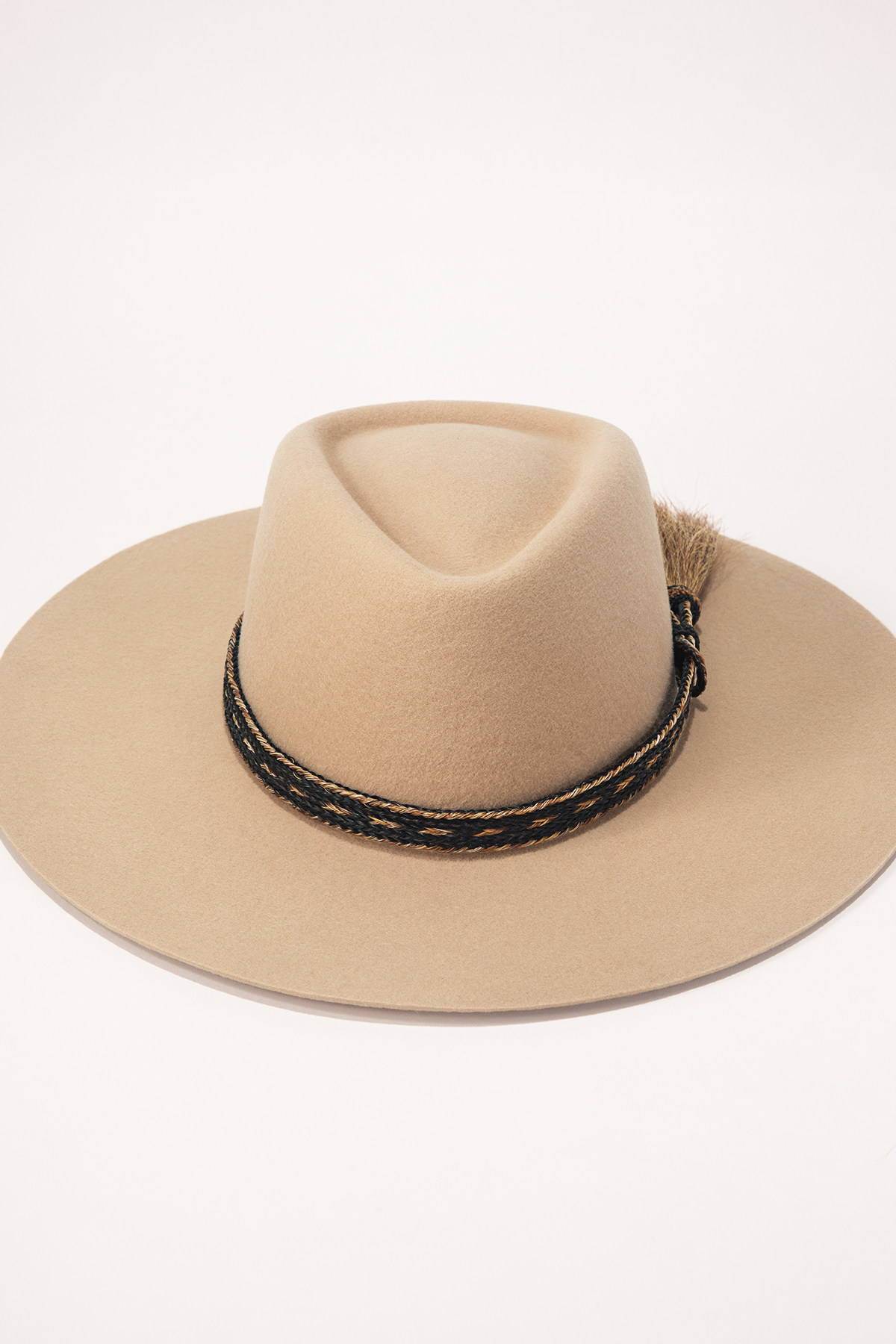 Hand-braided from genuine horsehair, this statement hat band channels that retro cowgirl spirit. Bold, untamed, and effortlessly cool. With intricate arrow-style weaving and long tassel ends, it’s the perfect blend of rugged charm and retro flair. A nod to desert sunsets, rodeo nights, and women who live with wild grace.
