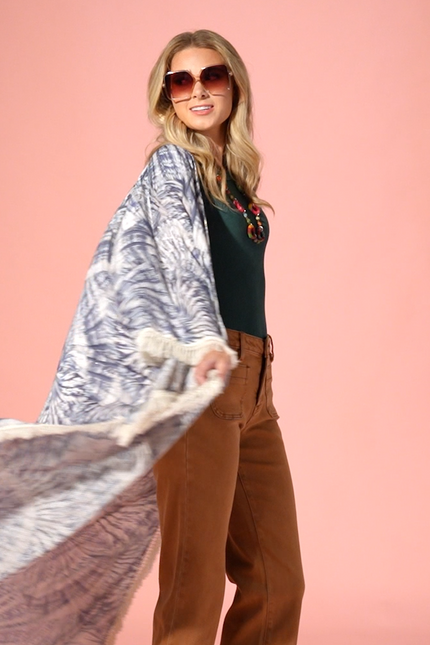 A fusion of midnight waves and deep sky blues, the Indigo Drift Kimono moves with effortless grace. Its bold tie-dye pattern mirrors the rhythm of rolling tides, while decorative fringe sleeves add a touch of retro-bohemian charm. Mysterious yet free-spirited, this statement piece is made for dreamers, wanderers, and those who embrace the flow.
