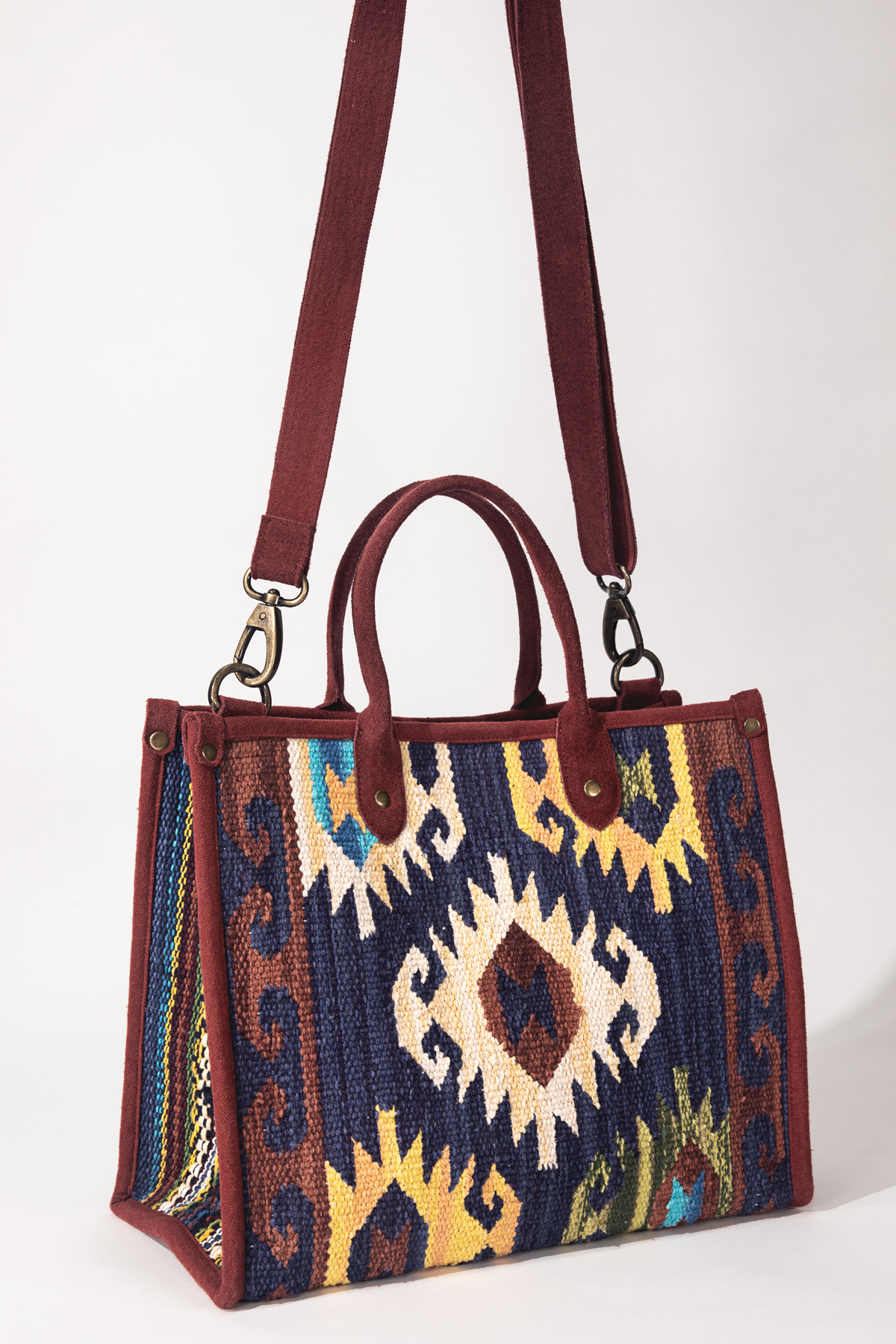 A tapestry of color and craft. The Indigo Trail Tote features an intricate woven motif on rich, yarn-dyed cotton, finished with genuine suede handles and an adjustable strap. Equal parts artisan and everyday, it’s the kind of piece that turns a simple outing into something worth remembering.