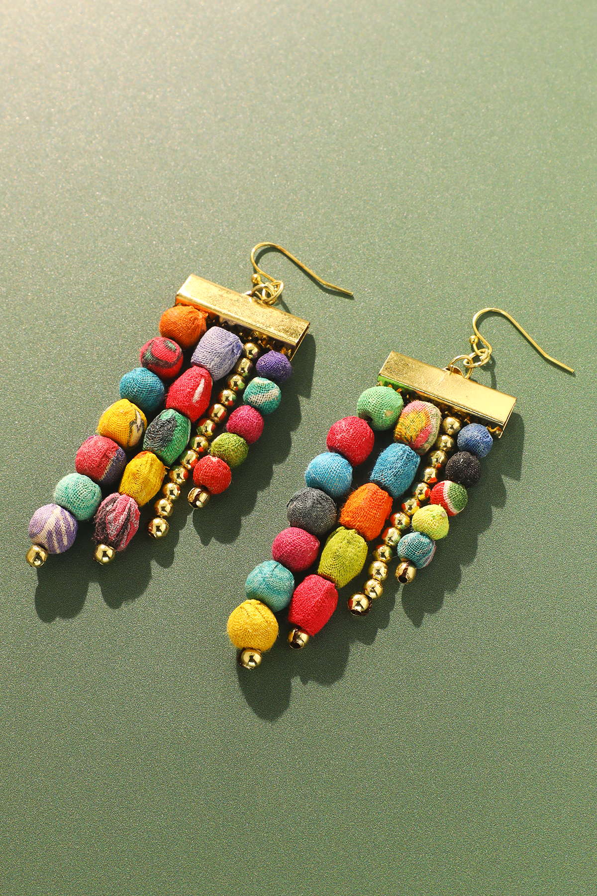 These stunning upcycled sari waterfall earrings feature vibrant, repurposed fabric with a cascading design, bringing texture and color to life. Bold and eco-conscious, they add a unique bohemian touch to any look. Crafted with care and sustainability in mind, our accessories showcase the beauty of upcycled Sari textiles. Each piece tells a unique story, born from the vibrant traditions of Indian craftsmanship and lovingly handcrafted by skilled women artisans. Every bead and fabric element is one-of-a-kind, ensuring that no two accessories are exactly alike. Due to the nature of repurposed materials, each item features its own distinct blend of colors and patterns, from the individual beads to the fabric components. This variation is not just a feature, but a celebration of authenticity and eco-conscious design. By choosing our accessories, you support both environmental responsibility and the empowerment of women artisans in India, while embracing a truly unique piece of wearable art.