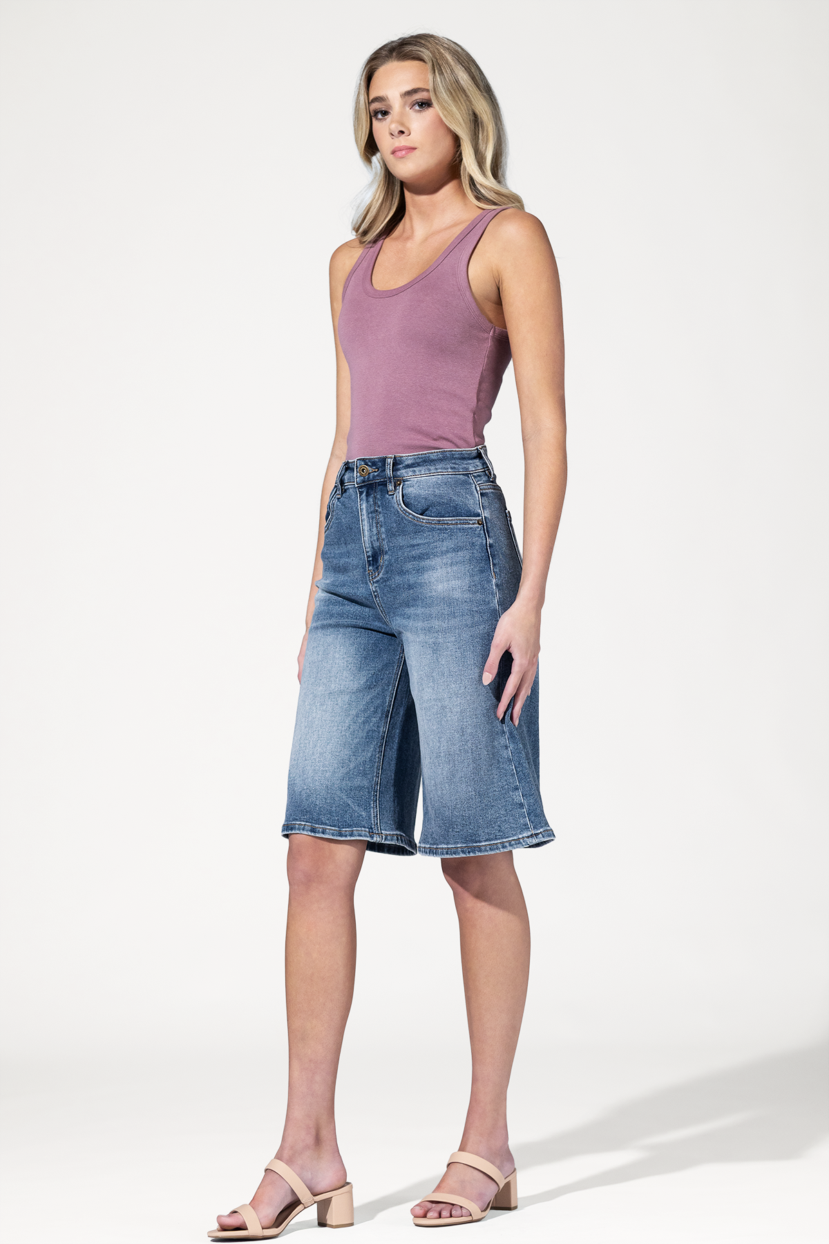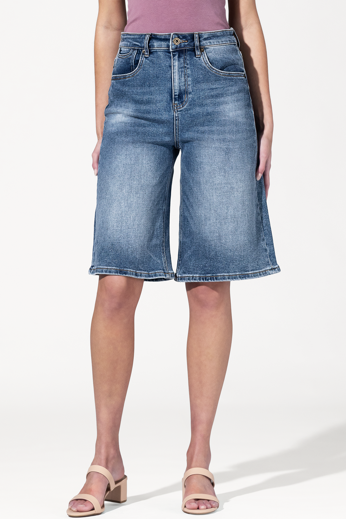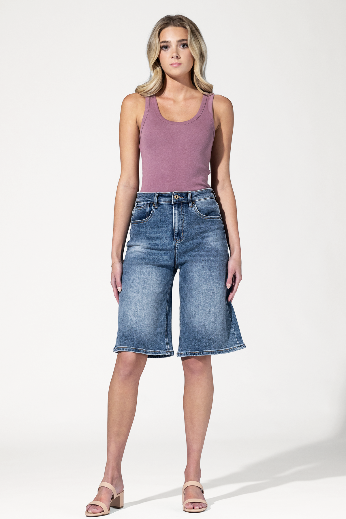 Relaxed, mid-wash denim with an unapologetic wide leg and longline cut. High-waisted and loose in all the right places. This is the cool-girl short that feels vintage without trying.