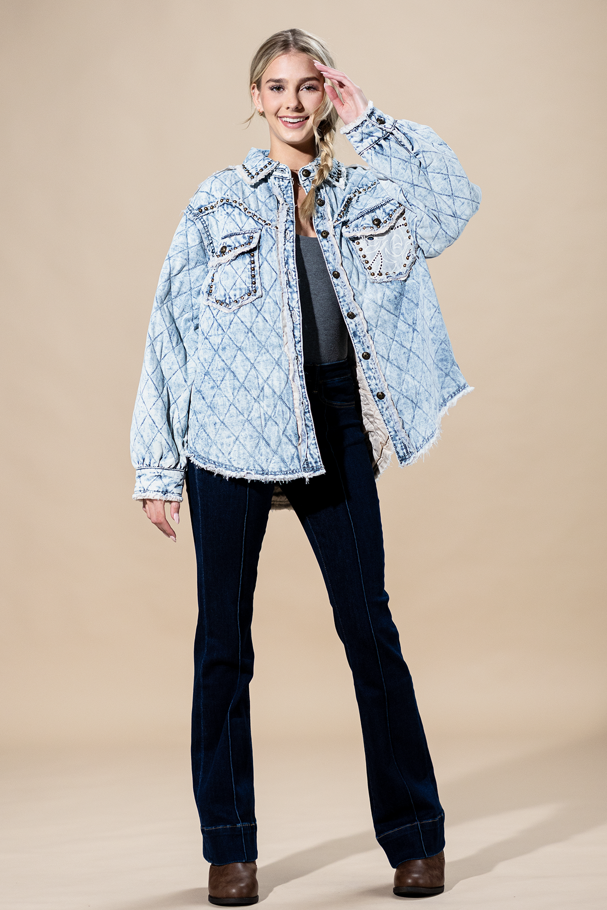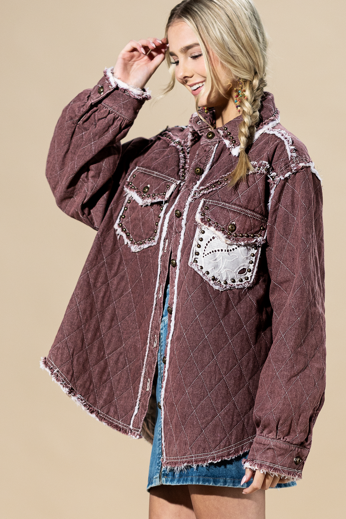 A vintage remix of texture and detail. The Mesilla Lacework Quilted Jacket combines rugged quilting with delicate lace insets and studded western yoke. A balance of grit and grace that feels distinctly Onedder. Designed with an oversized, throw on fit, it’s the layer you’ll live in from coffee runs to cold-weather markets.