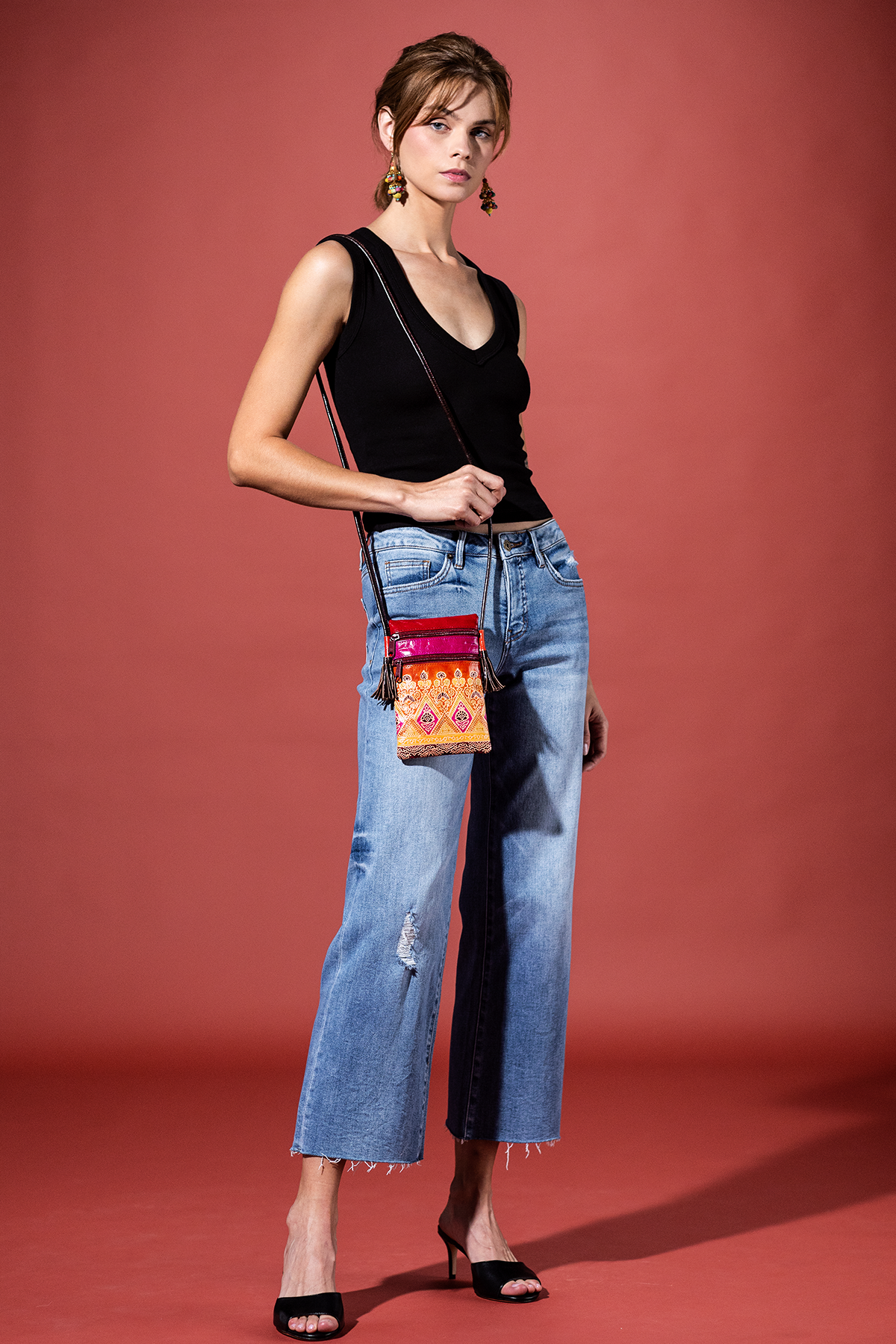 Hand-painted genuine leather cellphone bag with intricate embossed patterns in deep magenta, fuchsia, and warm amber tones. Featuring dual zip compartments and tassel accents, this vibrant yet functional piece is designed for the stylish wanderer who loves bold hues and artisanal craftsmanship.