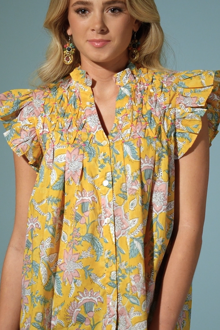 A button-up that blends retro prairie charm with pop-star polish. Ruffled sleeves, a bright marigold floral print, and a floaty fit make this the top you wear when you're somewhere between sweet and show-stopping.