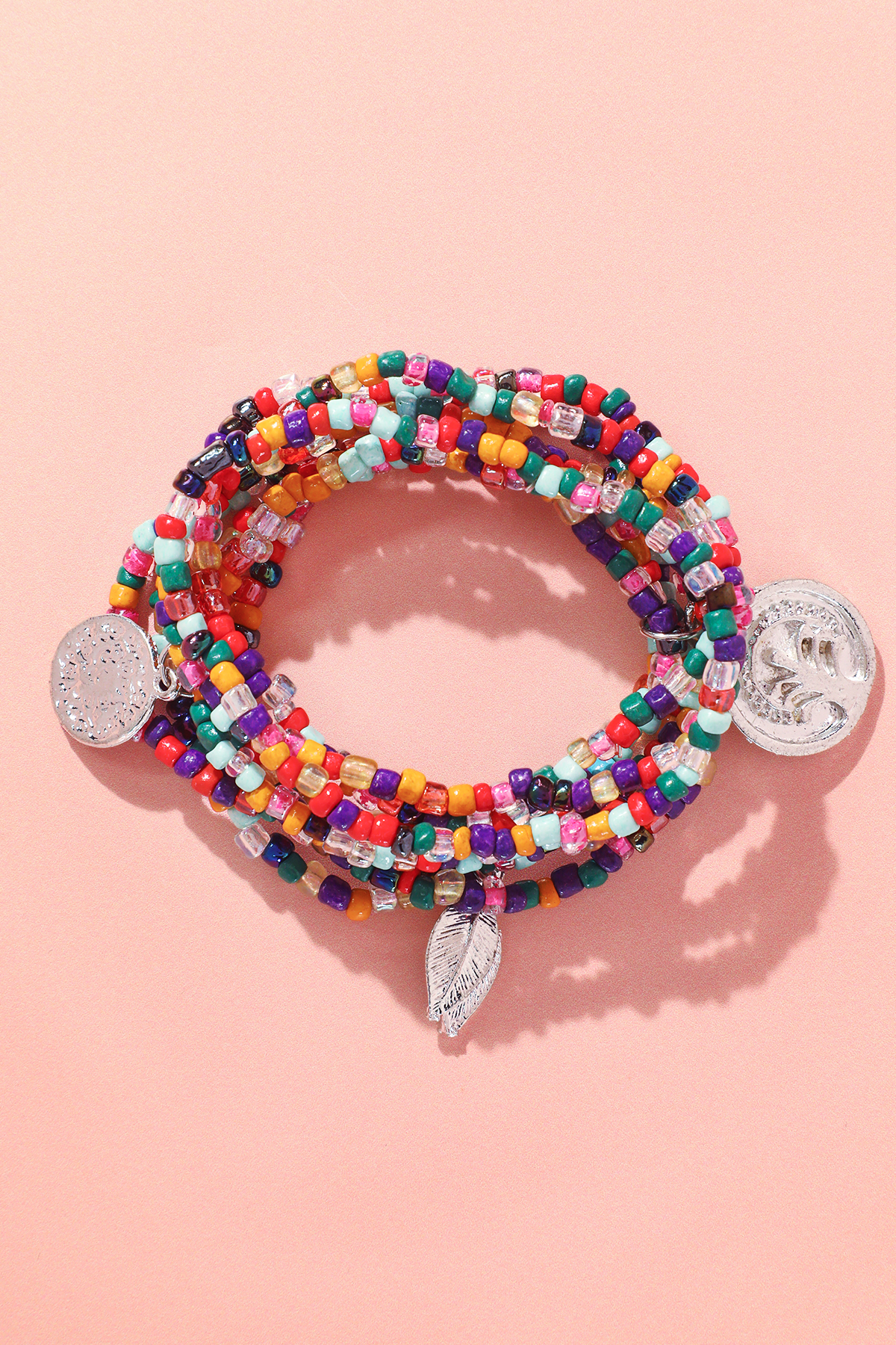 A rainbow of retro. This 9-layer stretch bracelet is stacked with colorful seed beads and silver-toned charms for a playful, throwback feel that’s bold, fun, and totally eye-catching.