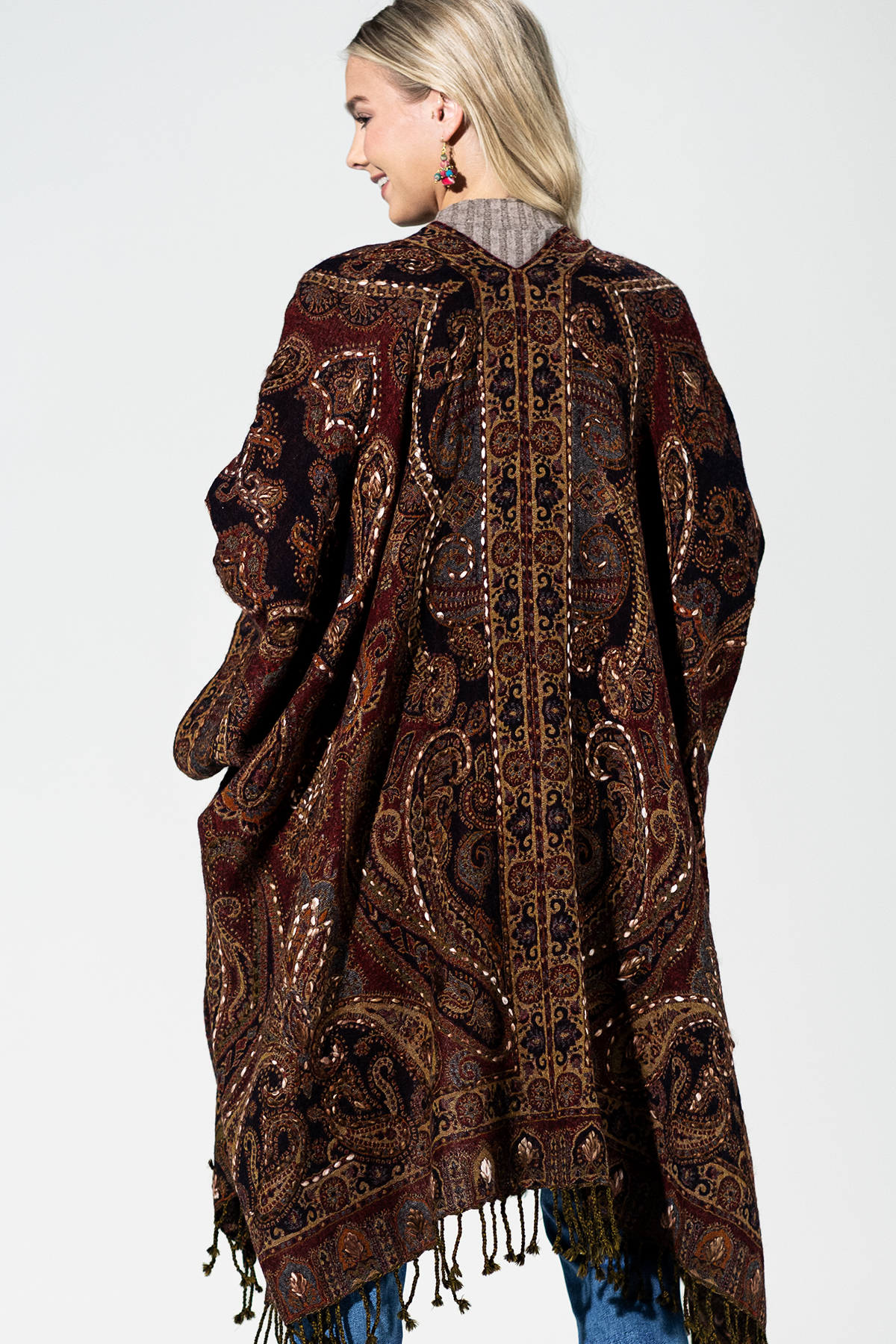 Inspired by wine country sunsets, the Masilla Hills Wool Ruana is handwoven in rich tones of chestnut, bronze, and gold. Intricate paisley patterns and hand-tied fringe bring depth and movement to its artisanal design. Soft, warm, and endlessly versatile.