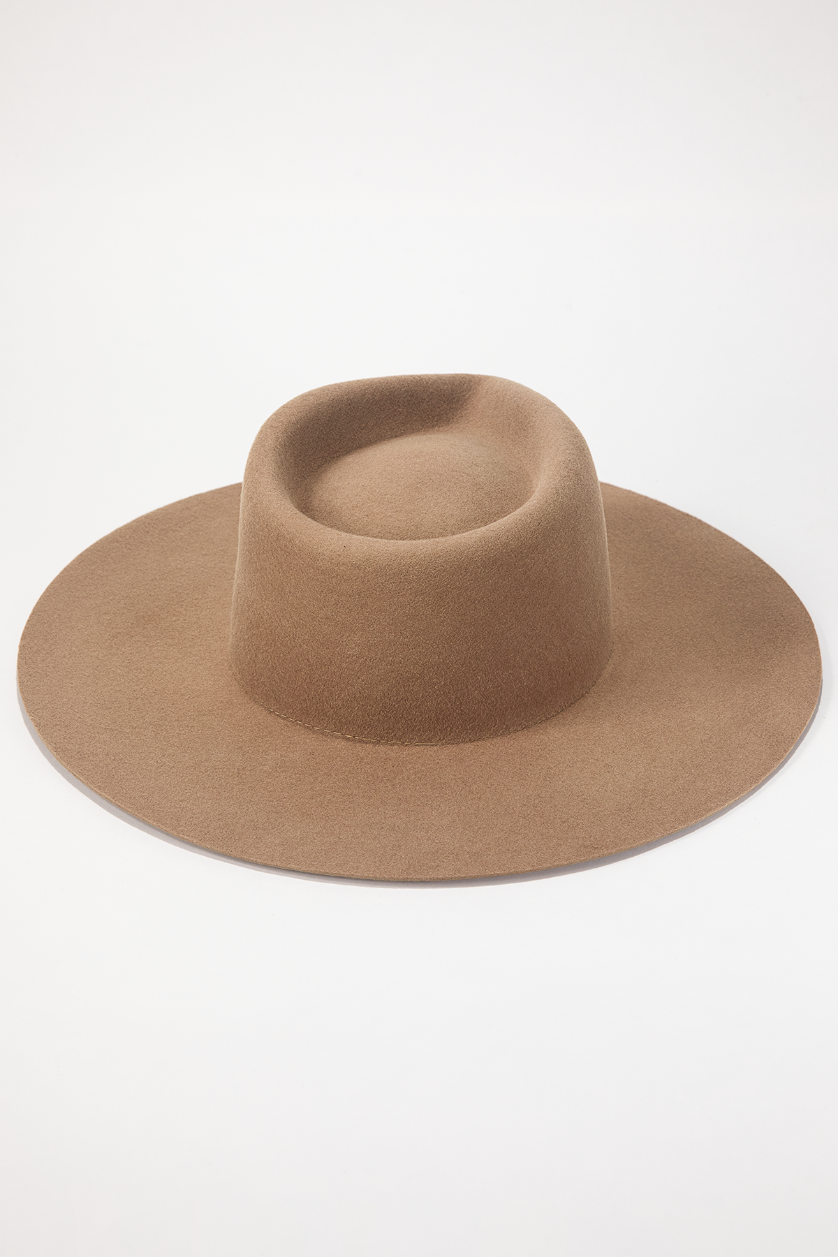 100% Australian wool hard brim Panama hat with a wide teardrop Crown shape & inner adjustable strap