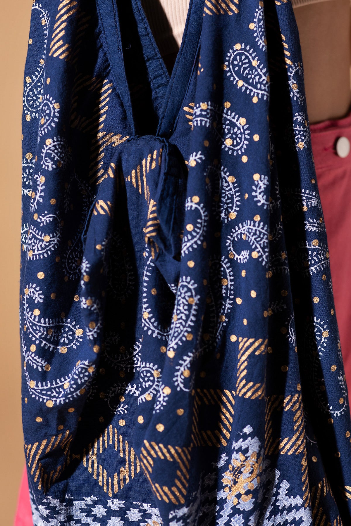 The Midnight Paisley Hobo Bag is a soft, hand block print cotton treasure featuring classic paisley and diamond shapes in an elegant ethnic print mix. The rich navy hue, accented with golden tones, opens to a practical zip closure, creating a piece that's both whimsical and grounded, perfect for adding a touch of the artisan to your daily journey.