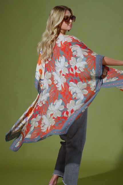 A harmony of wind-swept petals and flowing leaves, the Midnight Petals Kimono captures effortless movement and vintage charm. Its delicate floral print drapes beautifully, framed by a deep midnight blue border with intricate red and blue geometric accents. Lightweight and versatile, this piece layers effortlessly over denim and everyday staples, bringing a bohemian touch with a retro edge.