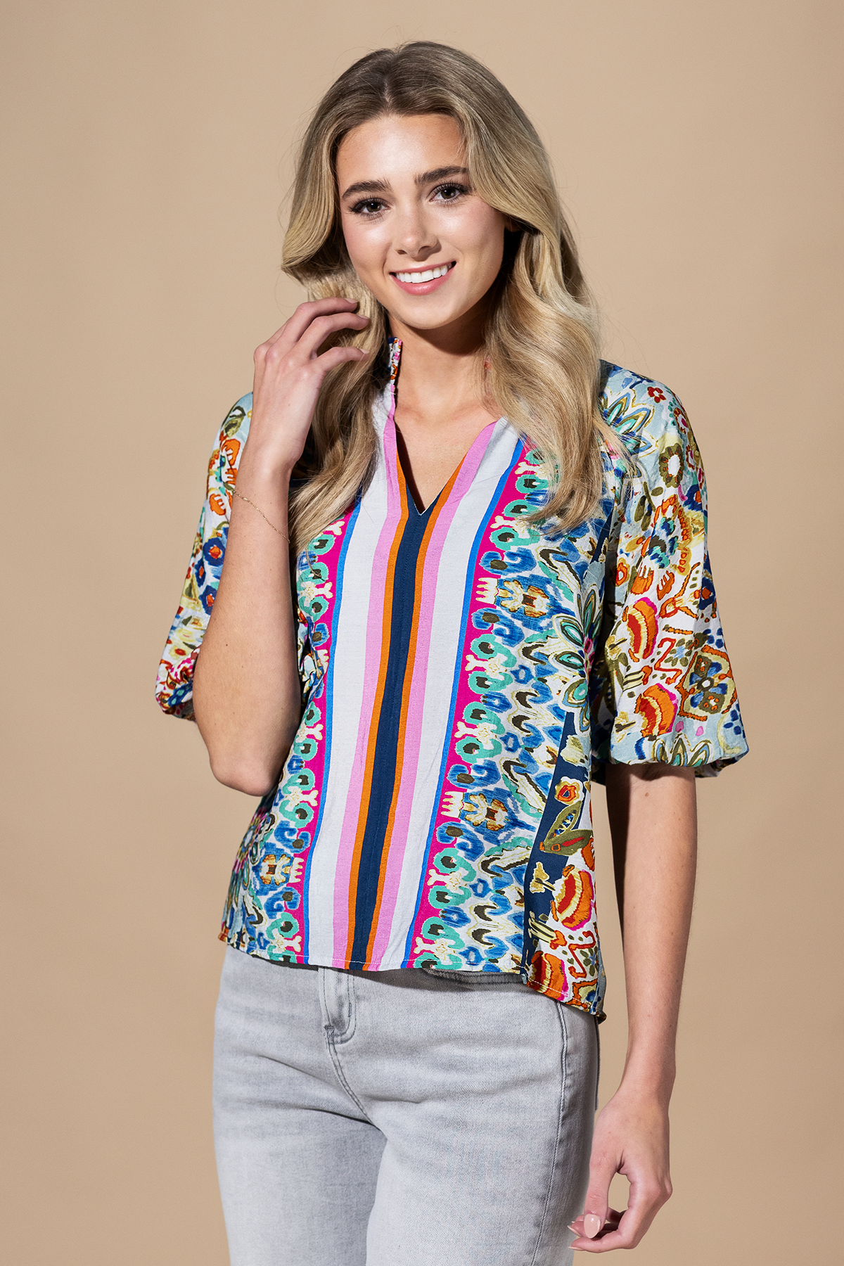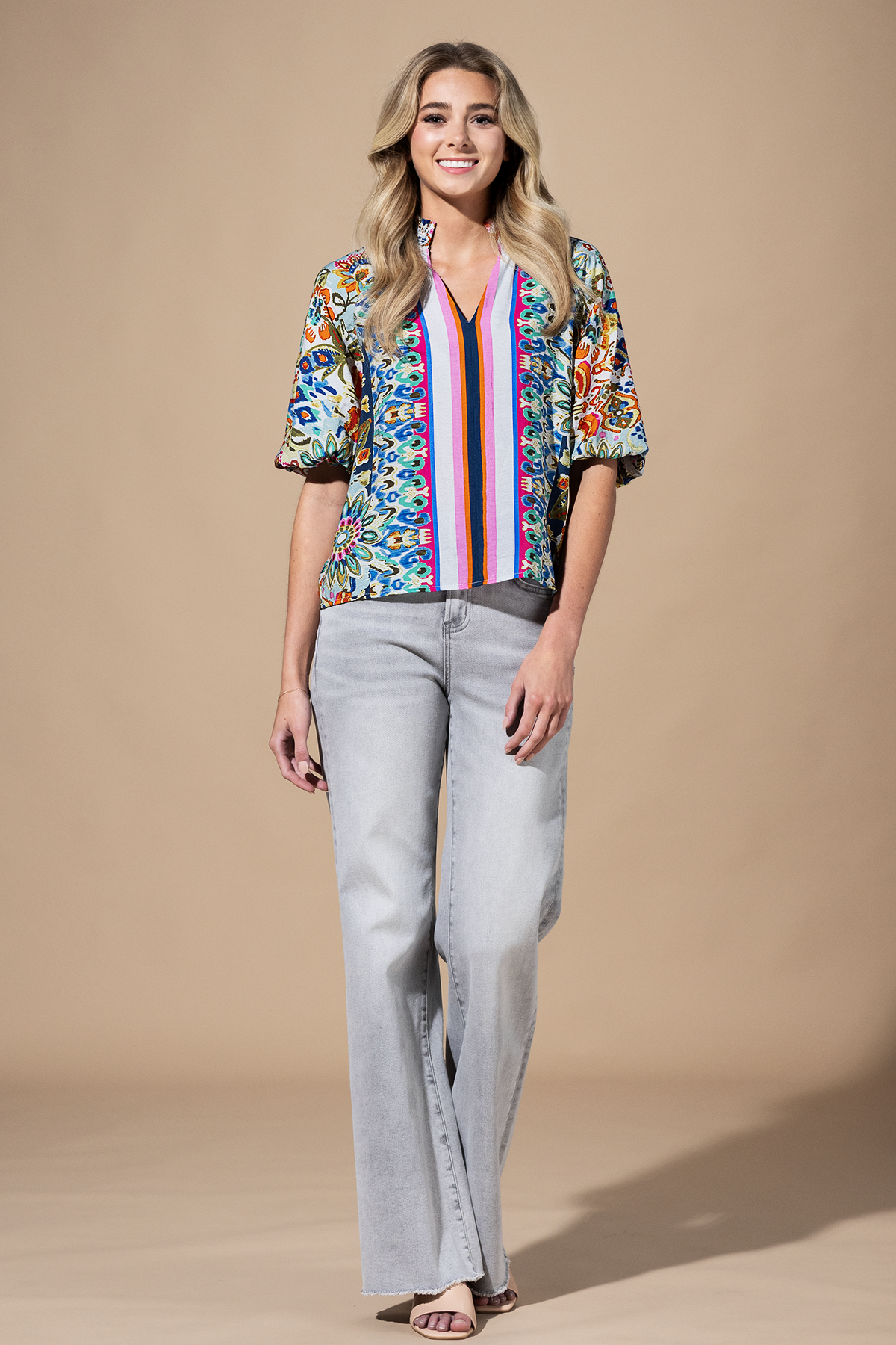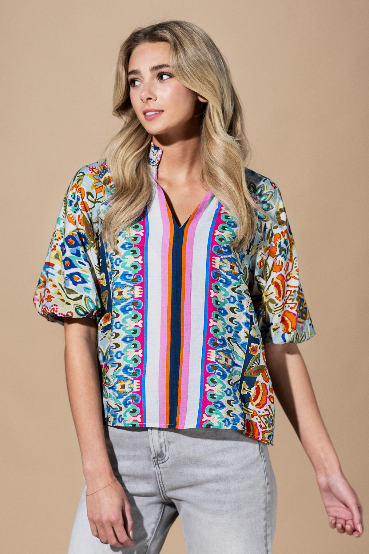 A retro remix of bold florals and striped brights, the Neon Nostalgia Top brings late-70s flair into the now. With a relaxed fit and stand collar detail, it's your go-to for adding a little disco drama to everyday denim or elevated summer looks.