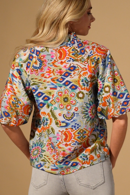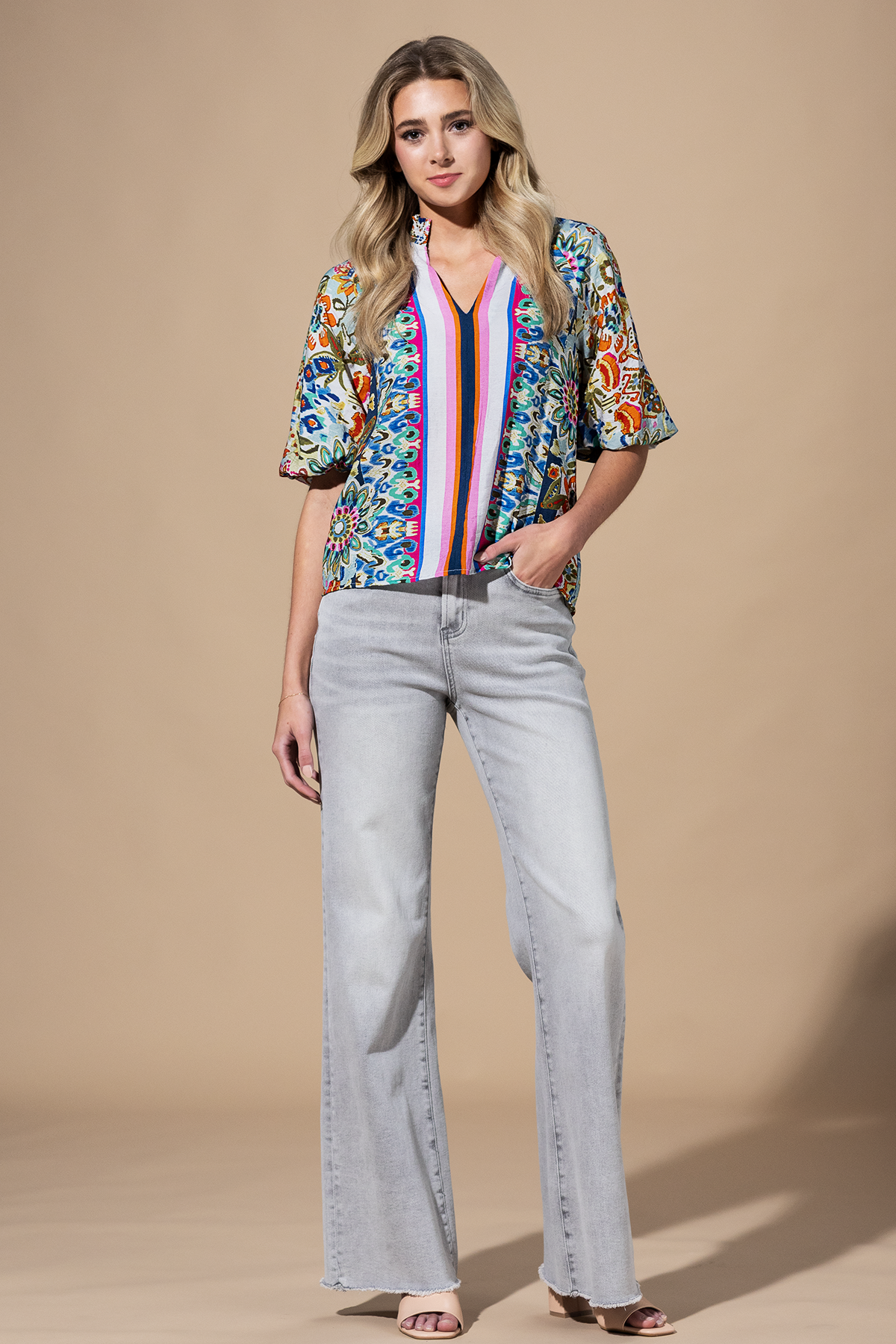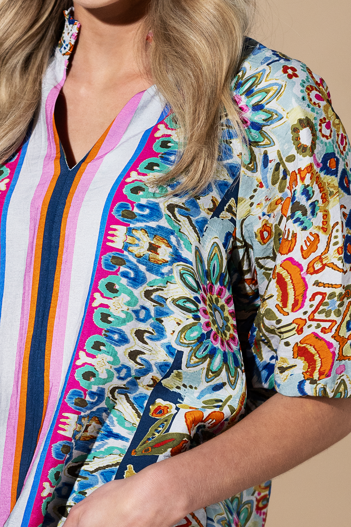 A retro remix of bold florals and striped brights, the Neon Nostalgia Top brings late-70s flair into the now. With a relaxed fit and stand collar detail, it's your go-to for adding a little disco drama to everyday denim or elevated summer looks.
