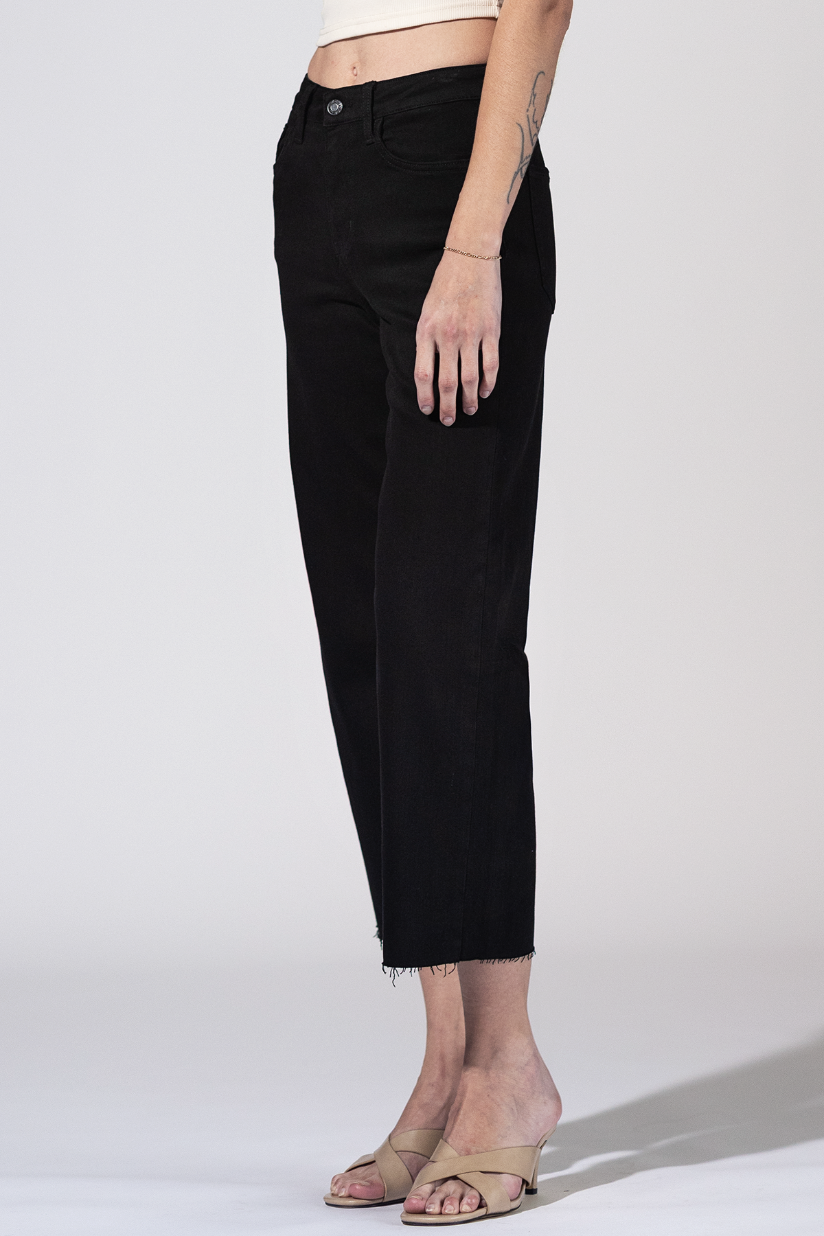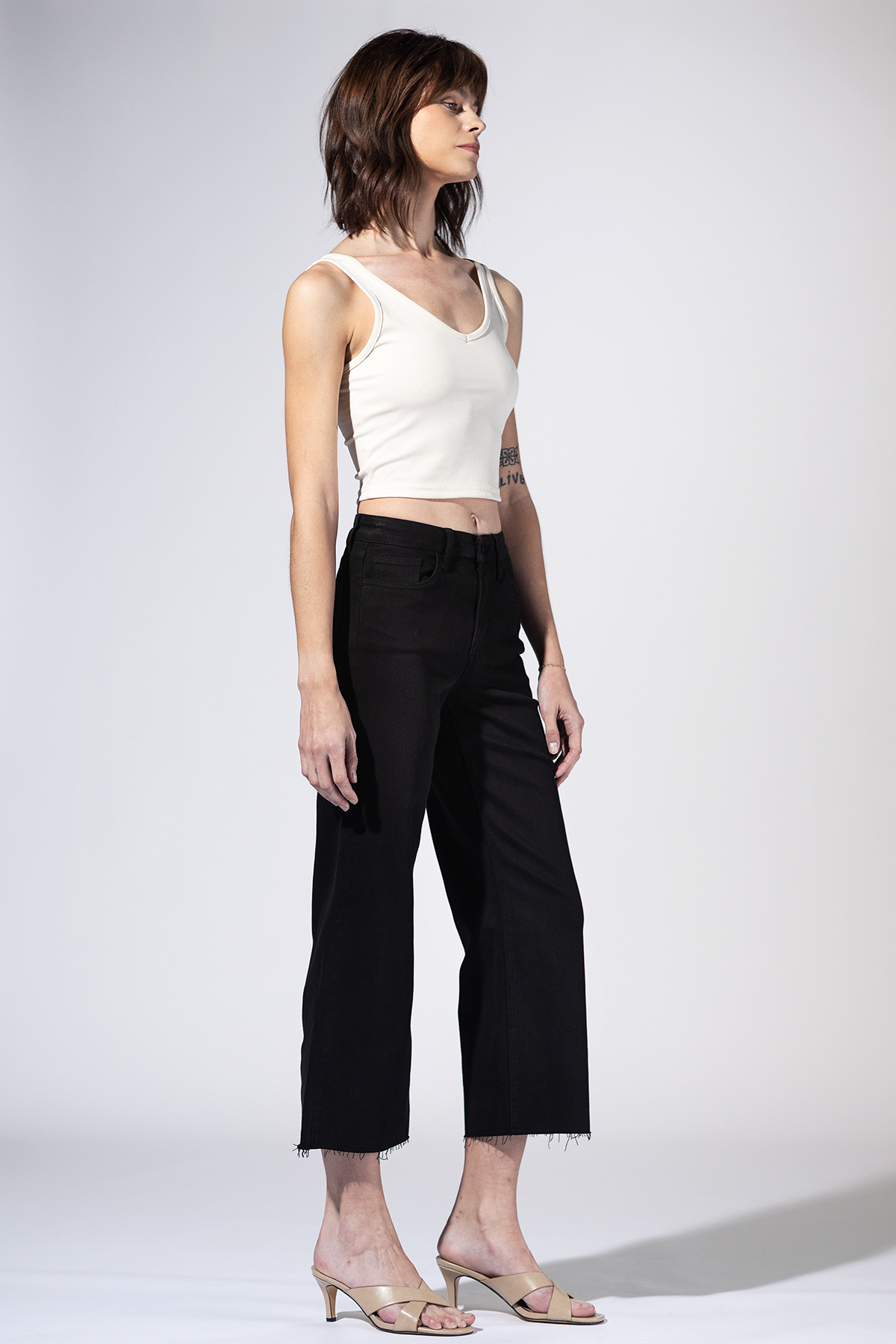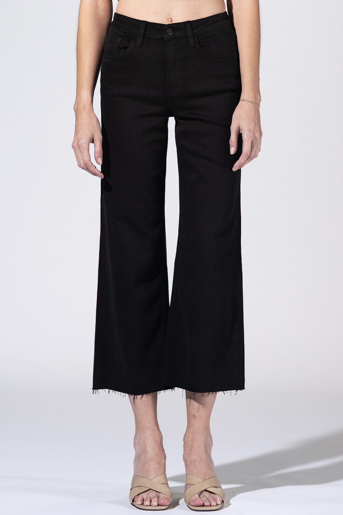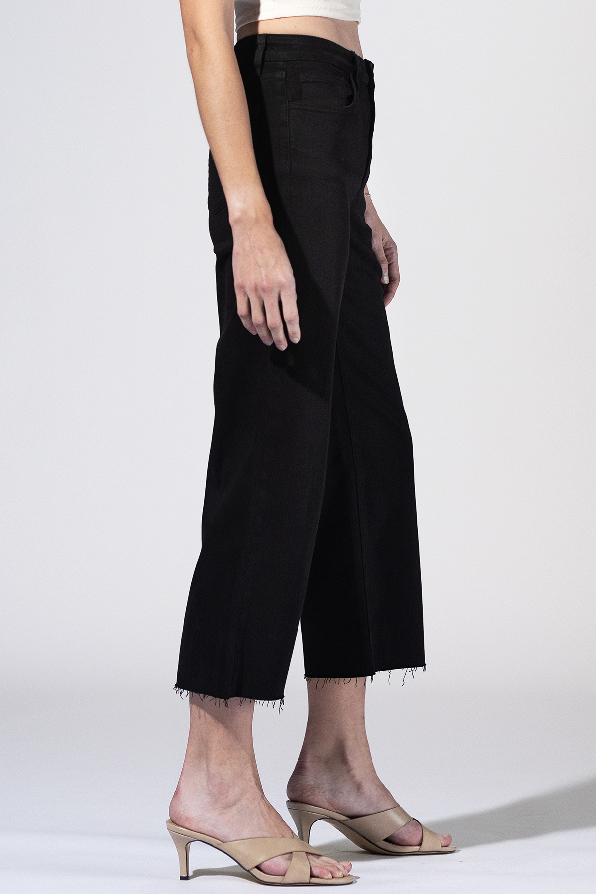 Sleek, simple, and endlessly versatile. The Nightfall High Rise Crop Jeans feature a high rise waist, soft stretch denim, and a raw hem that adds just the right edge. A modern wide leg silhouette made to move with you from day to night.