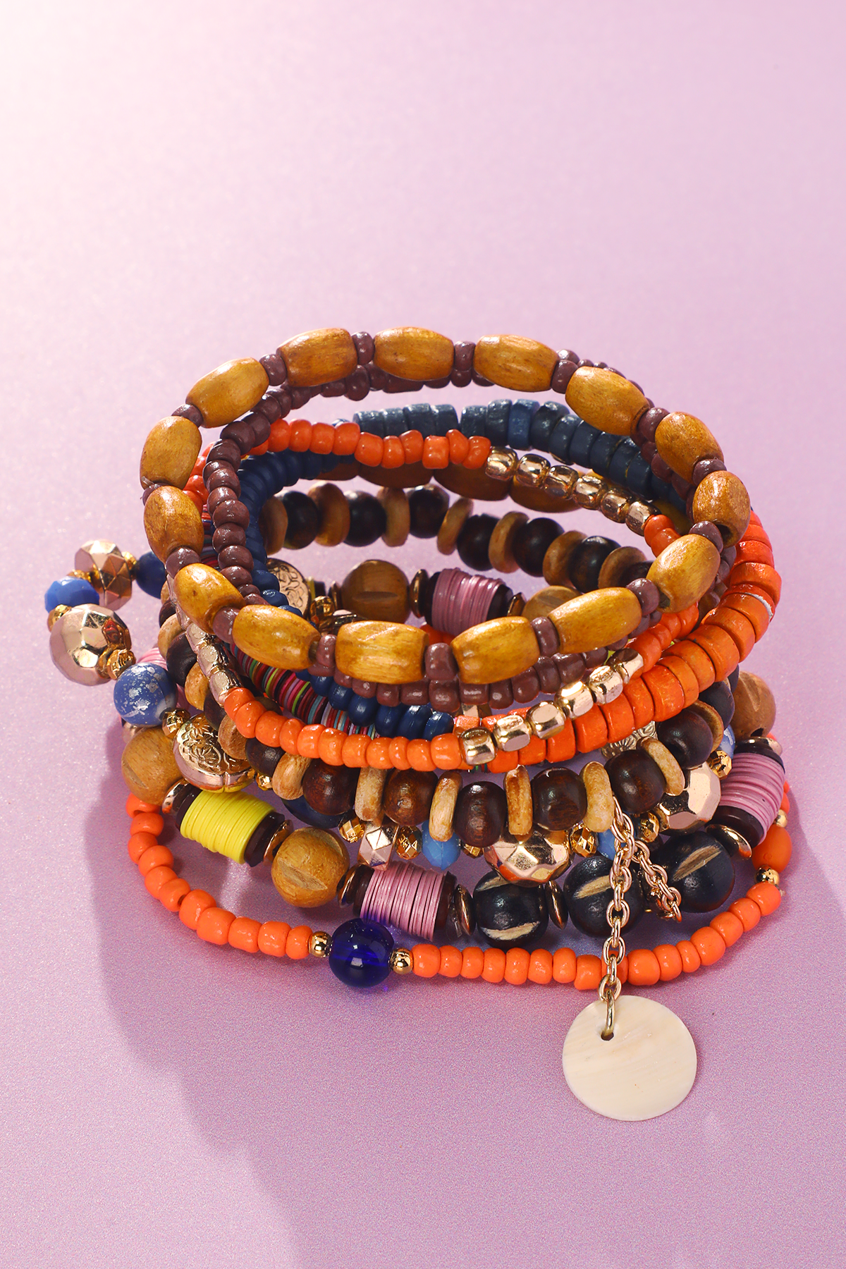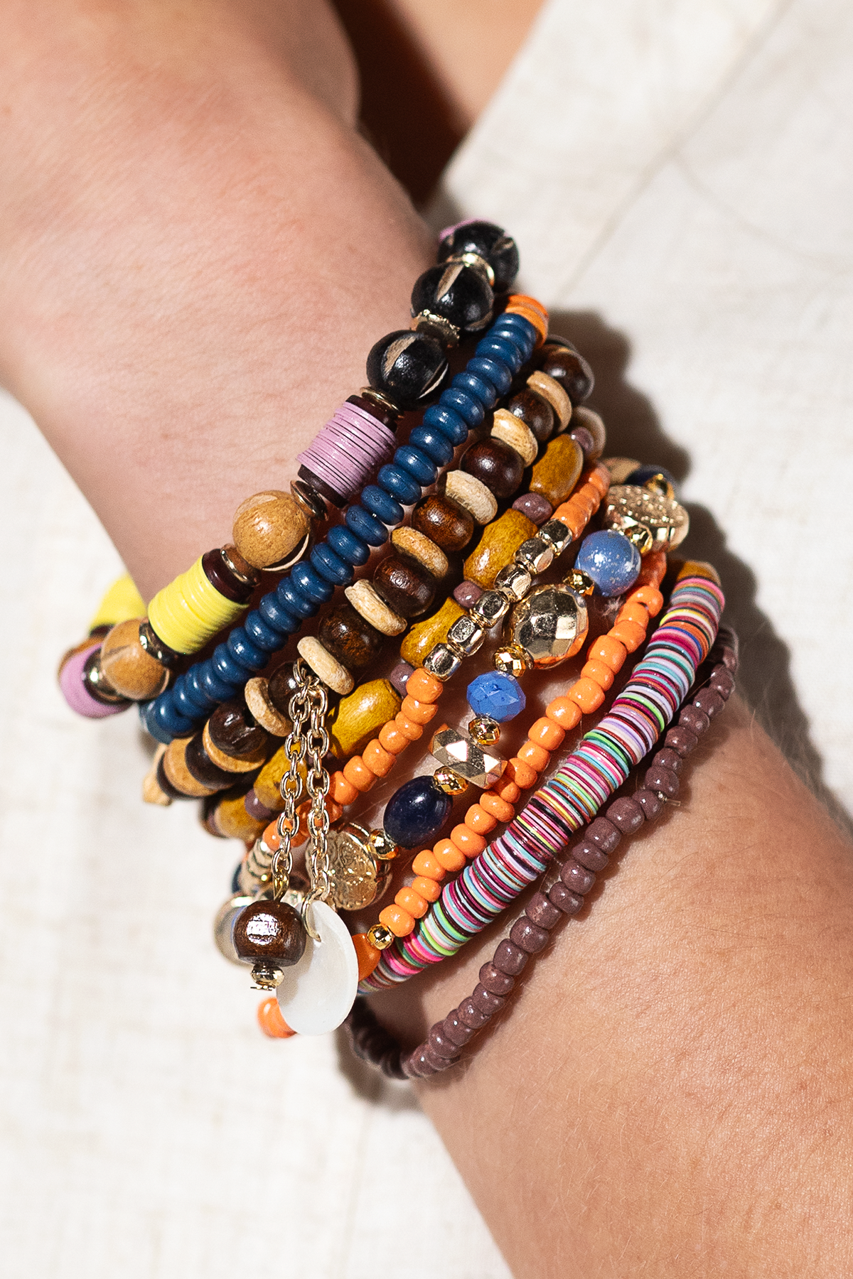 Dazzling, colorful, and handmade with love. A bold mix of wood, acrylic, rubber, and glass beads meets a pearl charm in this groovy, stackable bracelet made to shine.