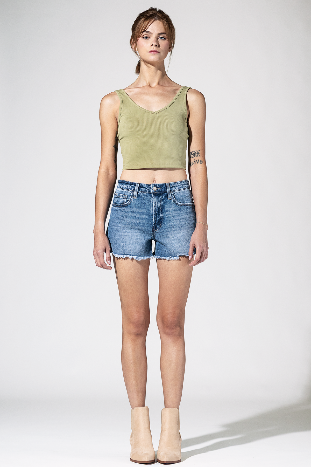 Crafted for warm days and golden hours, these refined cutoffs balance raw edge with effortless polish. The frayed hem adds just the right touch of undone charm, while the tailored high rise keeps it chic. Festival season or not, they’re made to be stage-ready.