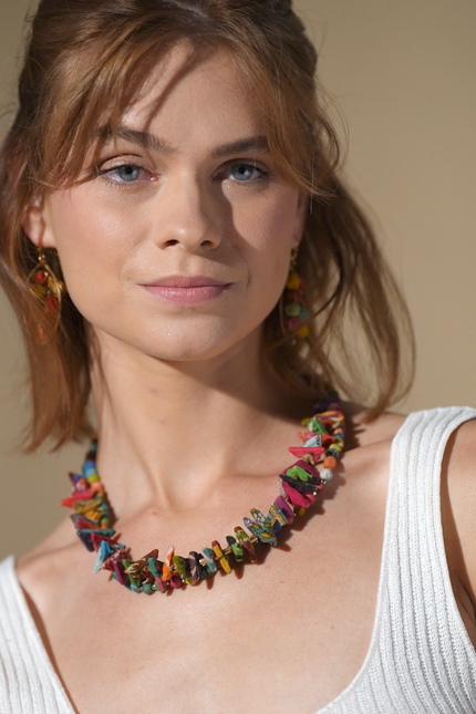Stylish fabric-beaded necklace featuring bold triangular beads—crafted from upcycled sari textiles for a modern, boho-chic edge. Crafted with care and sustainability in mind, our accessories showcase the beauty of upcycled Sari textiles. Each piece tells a unique story, born from the vibrant traditions of Indian craftsmanship and lovingly handcrafted by skilled women artisans. Every bead and fabric element is one-of-a-kind, ensuring that no two accessories are exactly alike. Due to the nature of repurposed materials, each item features its own distinct blend of colors and patterns, from the individual beads to the fabric components. This variation is not just a feature, but a celebration of authenticity and eco-conscious design. By choosing our accessories, you support both environmental responsibility and the empowerment of women artisans in India, while embracing a truly unique piece of wearable art.