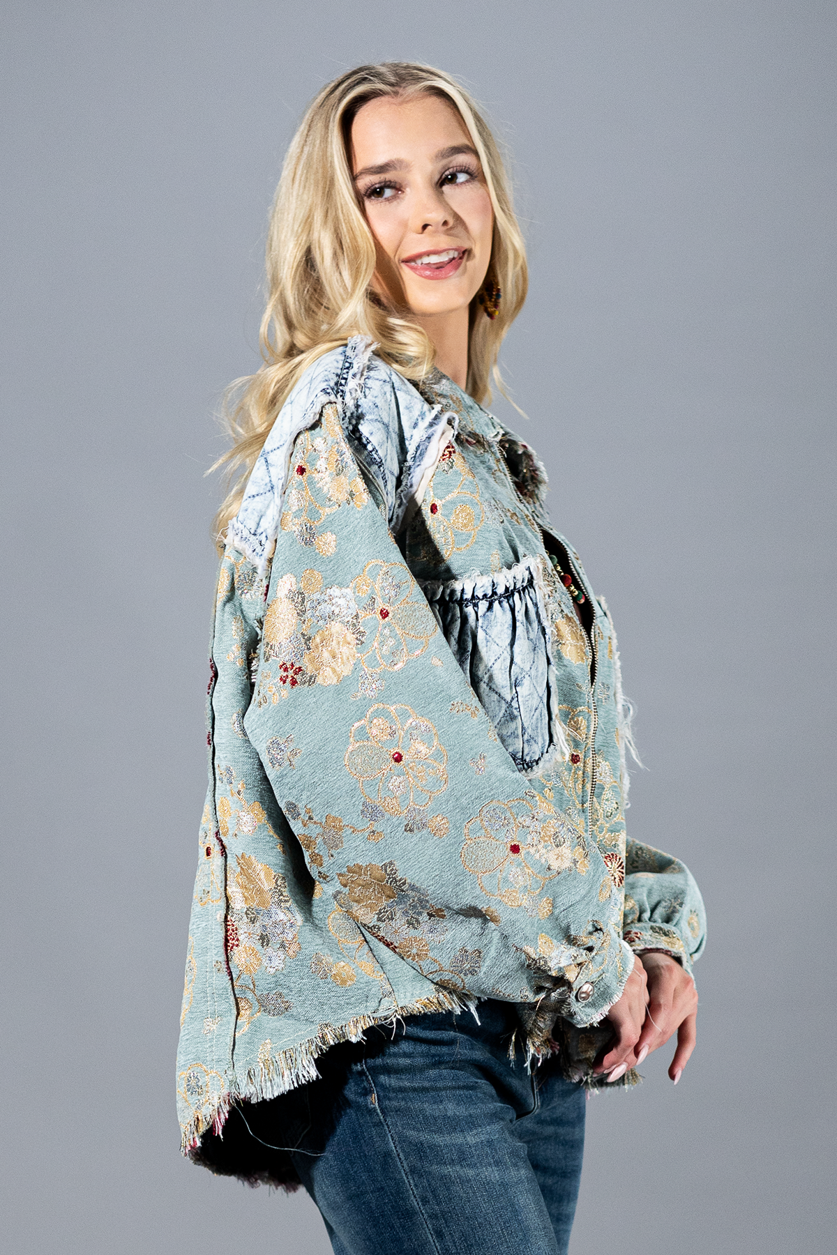 Bold and free-spirited. This jacket blends denim quilting, jacquard florals, balloon sleeves, and a vintage wash into one amazing everyday layer.