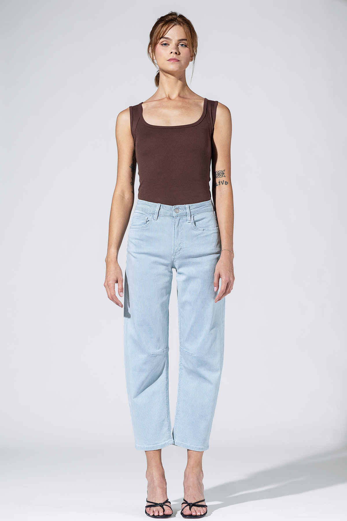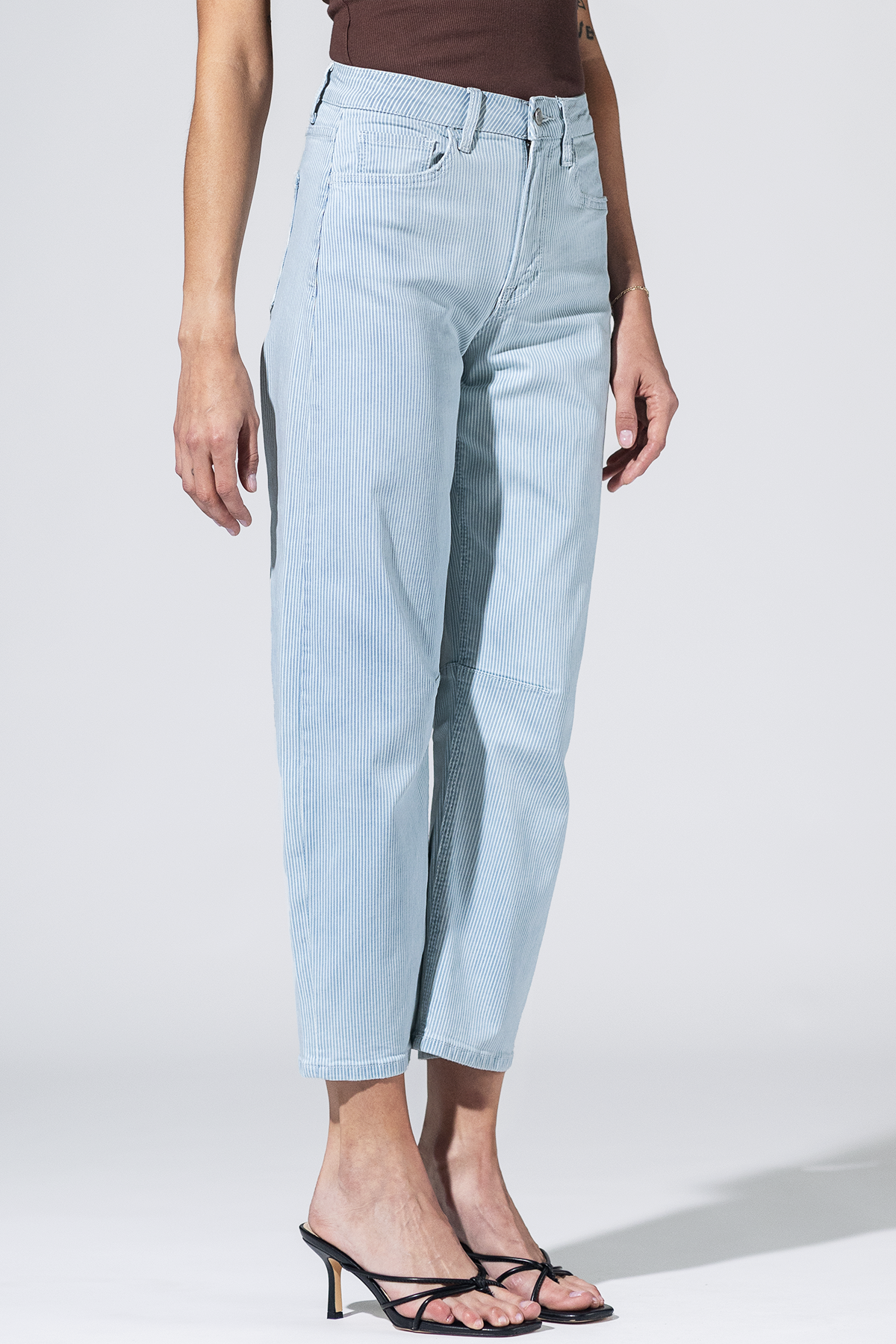 Soft like sun-faded denim and tough like a West Texas woman. The Prairie Lines Barrel Jean blends subtle pinstripes with a wide, easy leg that nods to vintage rodeo style. A flattering high rise, gentle barrel shape, and just-right ankle crop make these your go-to for boots, slides, or bare feet on the porch.