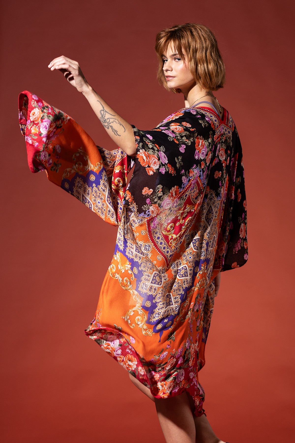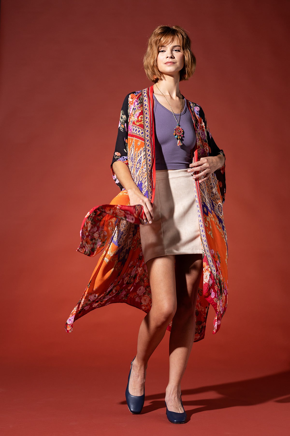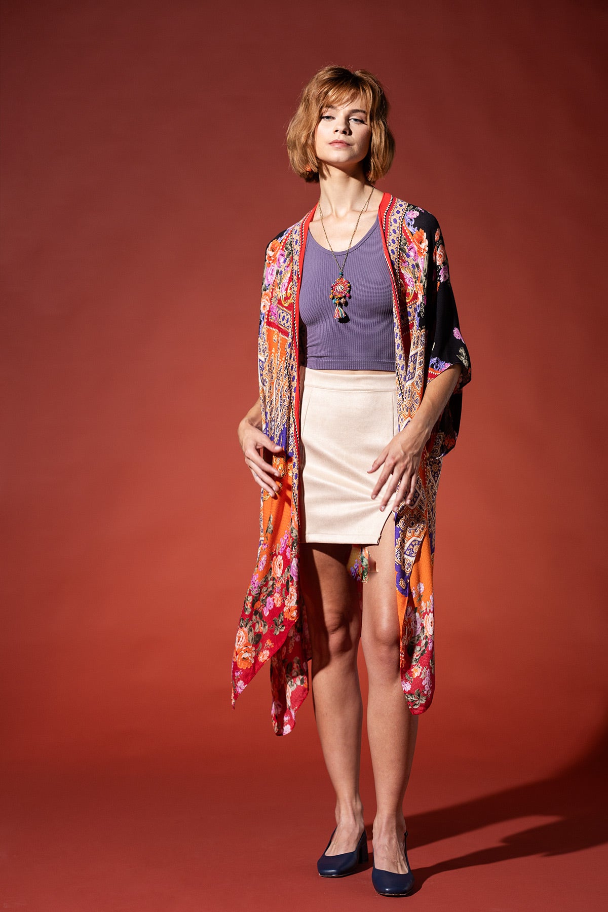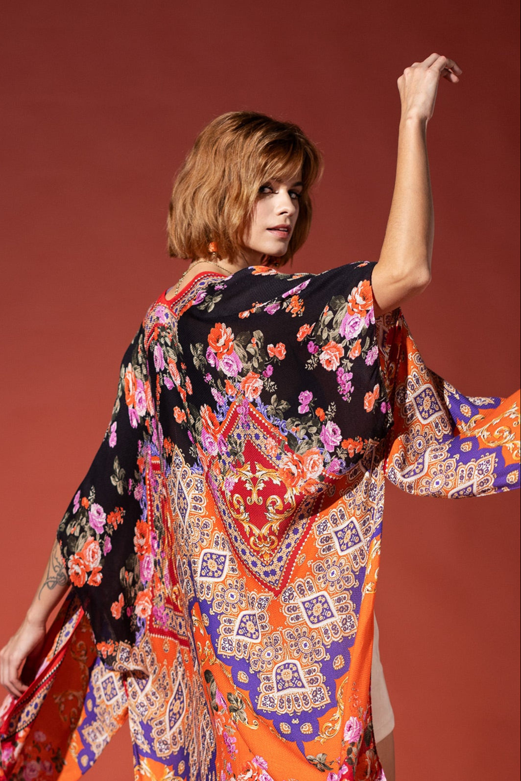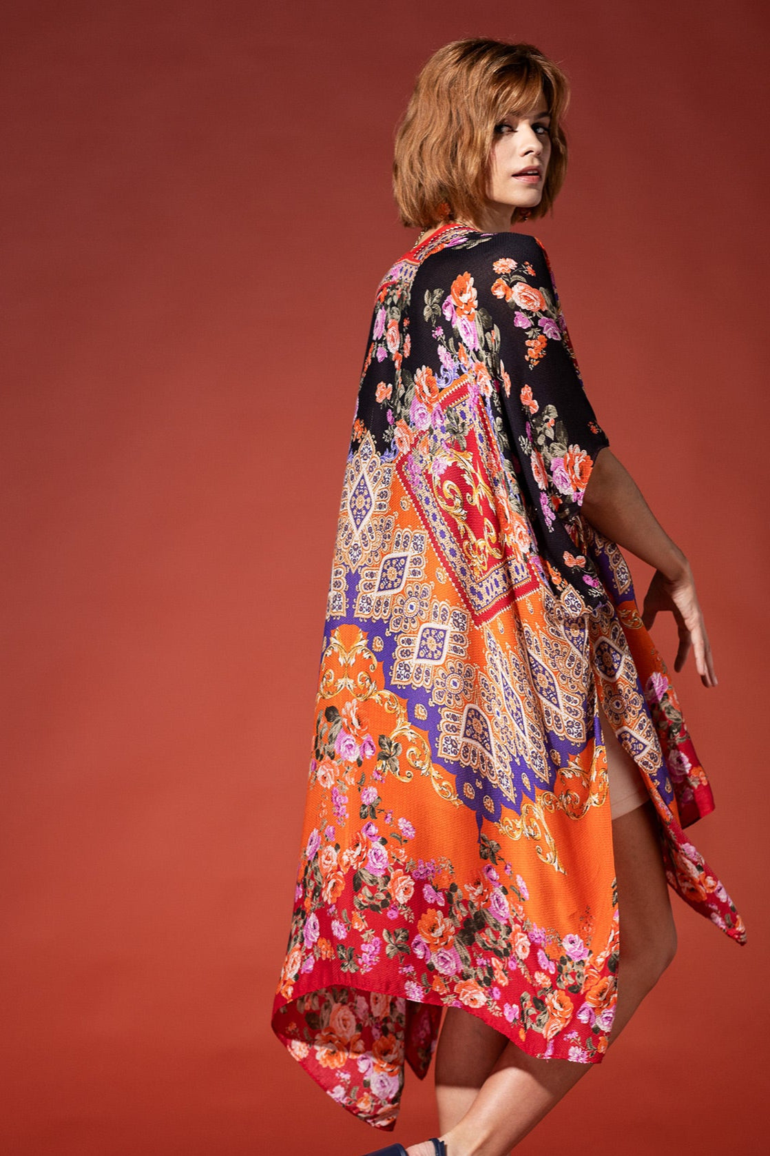 Drape yourself in the vibrant splendor of the Regal Floral Jacquard Kimono, where a medley of florals and royal prints dance on luxurious jacquard fabric. Multicolored and bright, it's a perfect fusion of bohemian charm and timeless elegance.