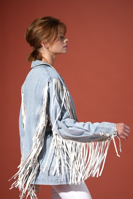 Western classic, meet renegade glam. This oversized denim blazer brings the drama with long fringe detailing that sways with every step. Finished with a structured shoulder and tailored back seam.