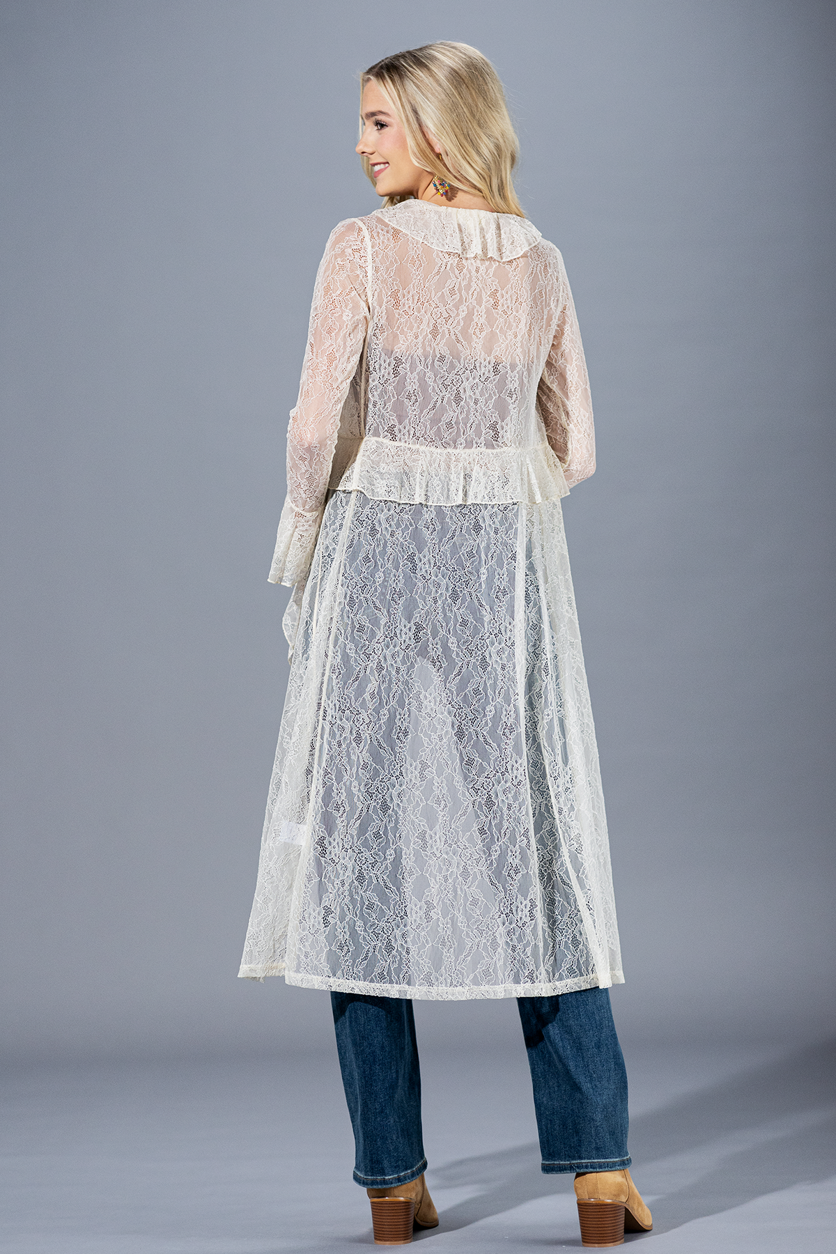 A touch of nostalgia, reimagined for the modern muse. The Keepsake Lace Duster layers sheer vintage lace with soft ruffle trim and romantic tie-front details. Its delicate charm meets western soul. Perfect over denim, boots, or your favorite slip dress. Light, timeless, and made for slow mornings and golden-hour adventures.