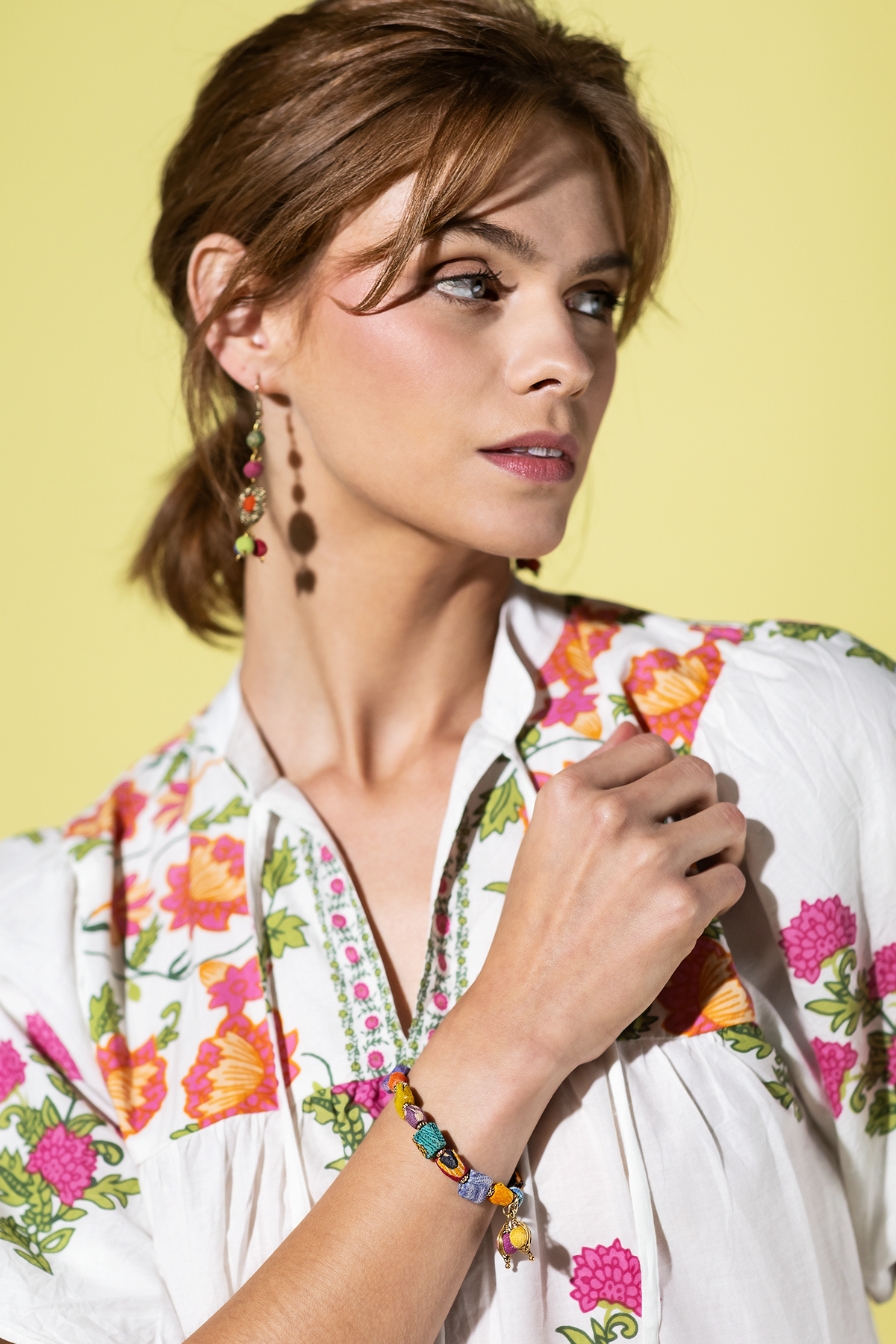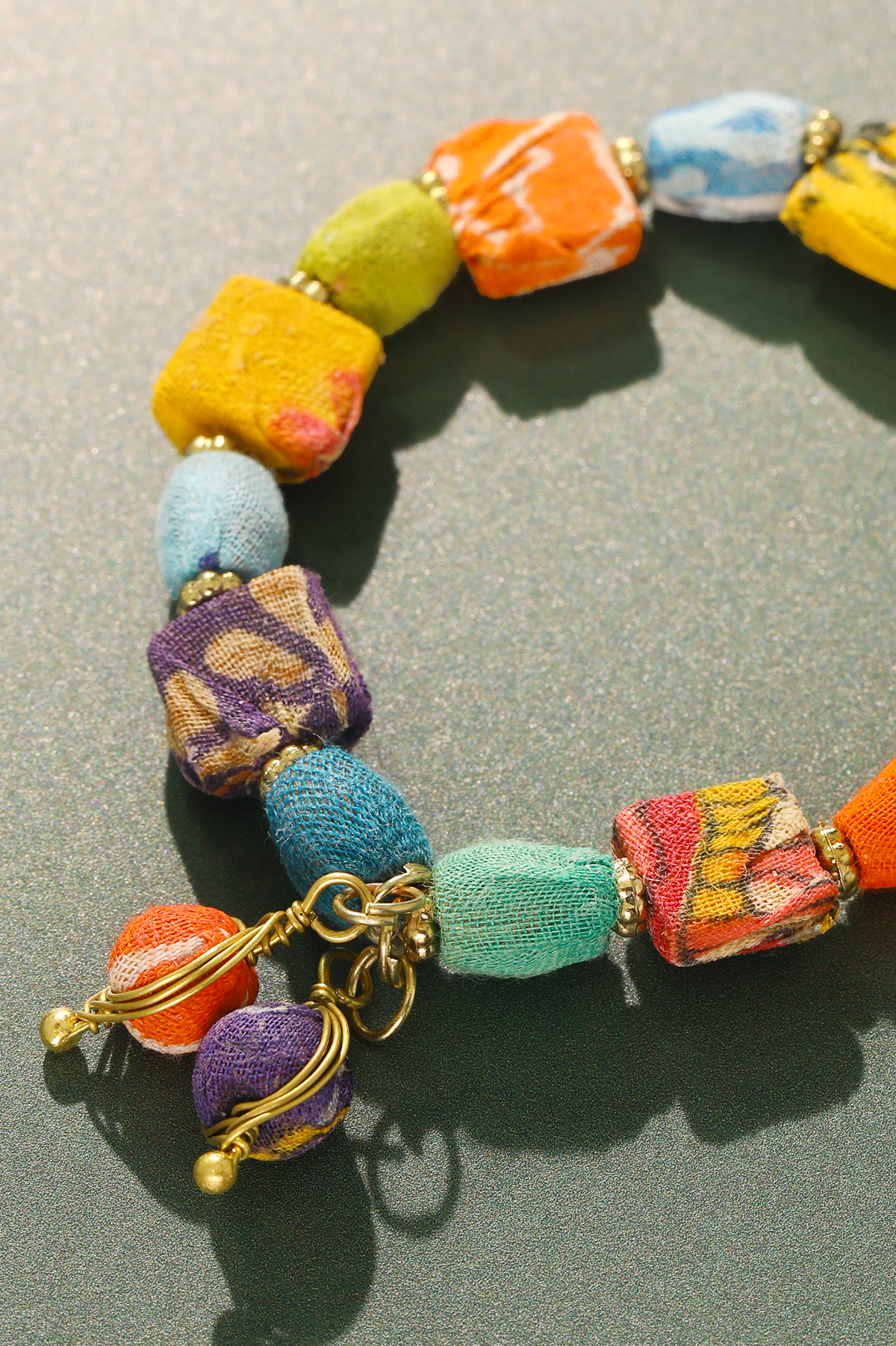 Playful hand-beaded bracelet featuring a mix of round and square beads—vibrant, versatile, and crafted from upcycled sari textiles. Crafted with care and sustainability in mind, our accessories showcase the beauty of upcycled Sari textiles. Each piece tells a unique story, born from the vibrant traditions of Indian craftsmanship and lovingly handcrafted by skilled women artisans. Every bead and fabric element is one-of-a-kind, ensuring that no two accessories are exactly alike. Due to the nature of repurposed materials, each item features its own distinct blend of colors and patterns, from the individual beads to the fabric components. This variation is not just a feature, but a celebration of authenticity and eco-conscious design. By choosing our accessories, you support both environmental responsibility and the empowerment of women artisans in India, while embracing a truly unique piece of wearable art.