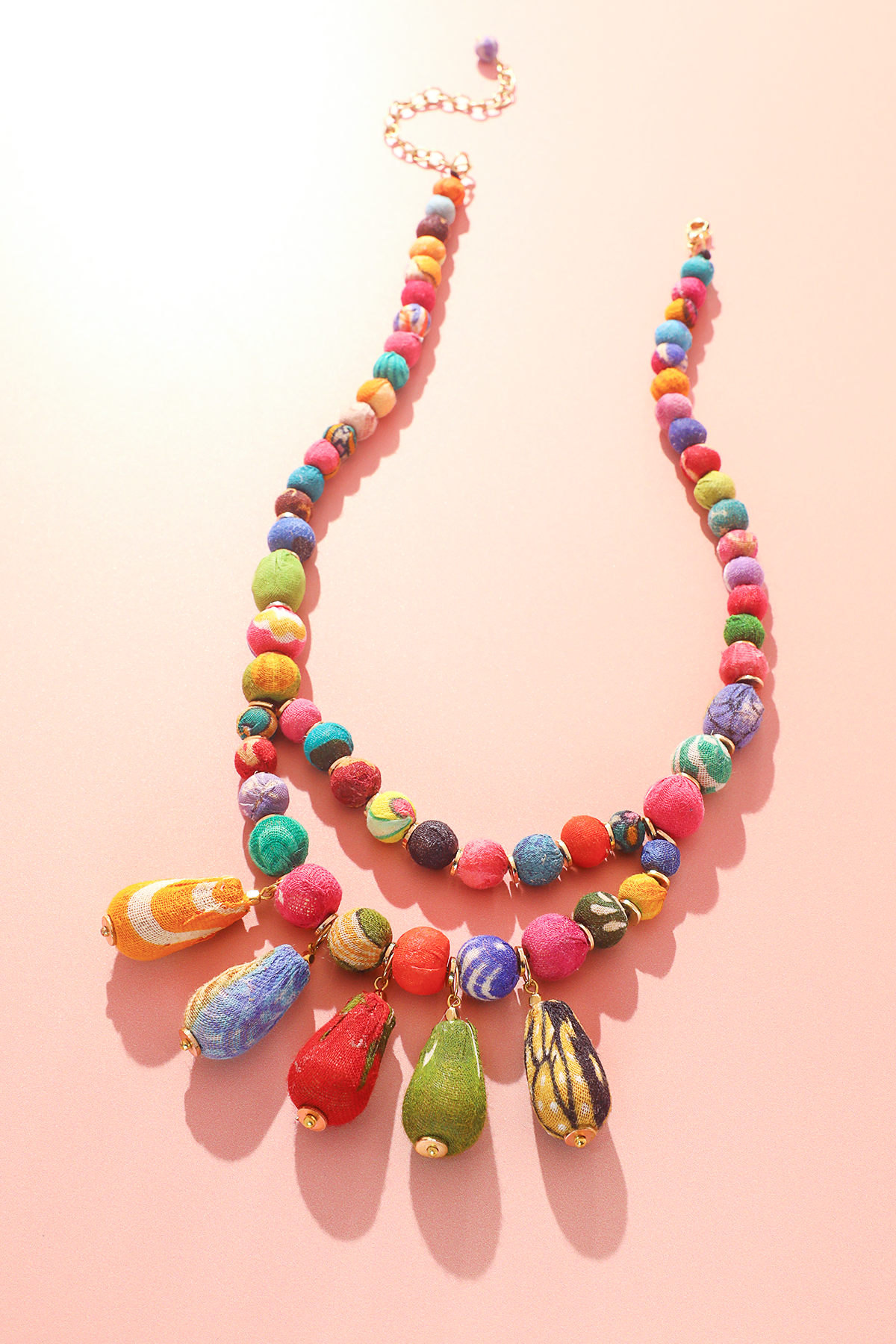 A radiant necklace featuring cascading fabric-wrapped beads in bold, dangling shapes—handcrafted for a dynamic, one-of-a-kind statement. Crafted with care and sustainability in mind, our accessories showcase the beauty of upcycled Sari textiles. Each piece tells a unique story, born from the vibrant traditions of Indian craftsmanship and lovingly handcrafted by skilled women artisans. Every bead and fabric element is one-of-a-kind, ensuring that no two accessories are exactly alike. Due to the nature of repurposed materials, each item features its own distinct blend of colors and patterns, from the individual beads to the fabric components. This variation is not just a feature, but a celebration of authenticity and eco-conscious design. By choosing our accessories, you support both environmental responsibility and the empowerment of women artisans in India, while embracing a truly unique piece of wearable art.