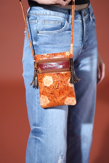 A tribute to the rugged beauty of the desert, the Sierra Mesa Crossbody blends hand-painted leather with an intricate embossed floral motif. Its warm caramel and deep brown tones echo sunlit canyon walls, while tassel accents add a touch of Western flair. Compact yet functional, it's the perfect piece for effortless, everyday adventure.