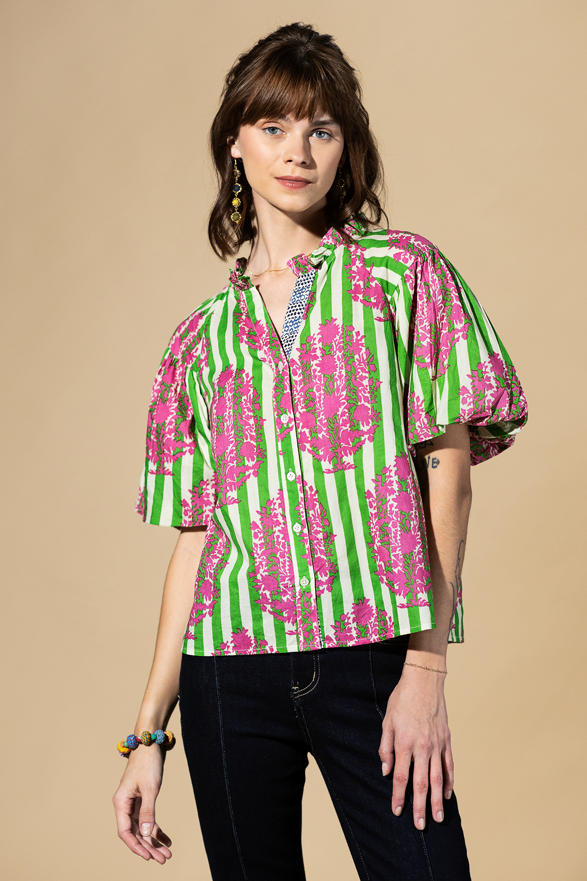 The Palm Parade Top brings pure joy with punchy pink florals dancing over retro green stripes. The boxy puff-sleeve cut keeps it easy, breezy, and statement-ready. Perfect with white denim or cut-offs on those “might-turn-into-mimosas” kind of mornings
